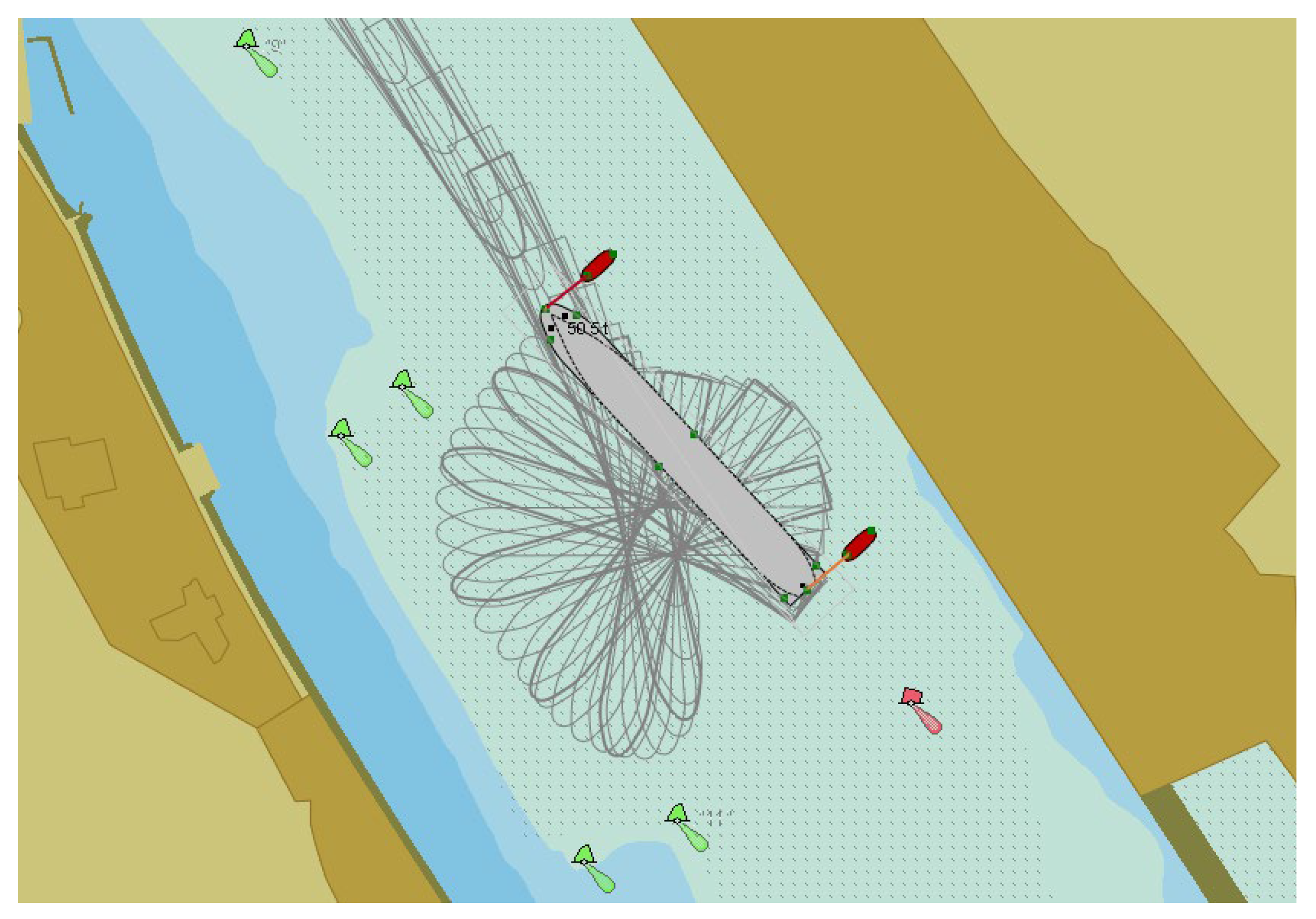 When assessing the sustainability of the ship’s arrival and departure from the quay, the depth of the nearby water area and the power (traction force) of the tugs used are very important. In the case where there are enough tugs in the port and their traction force is high, optimal solutions can be found, but it is always very important to assess the required traction forces of the tugboats in advance.