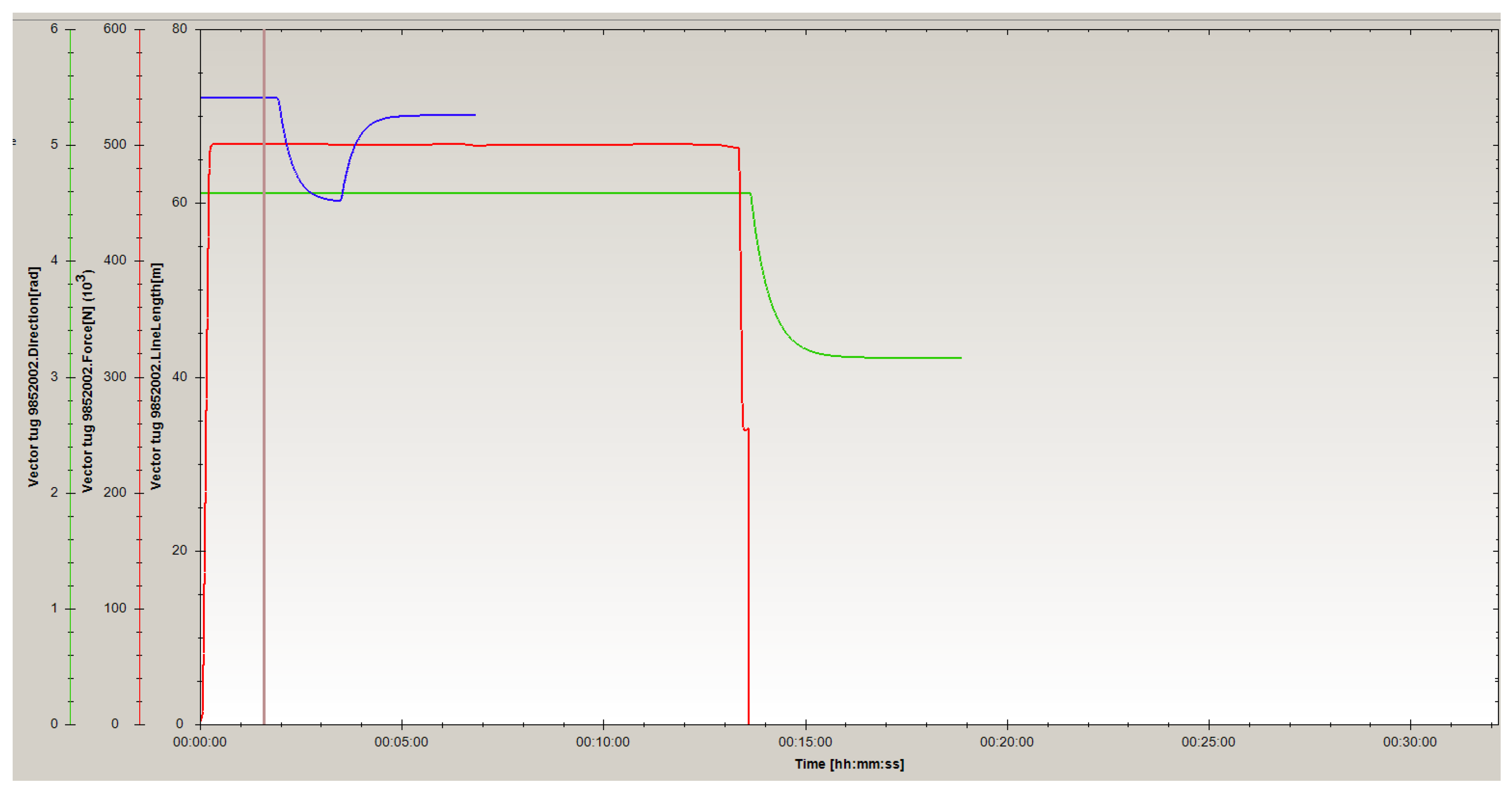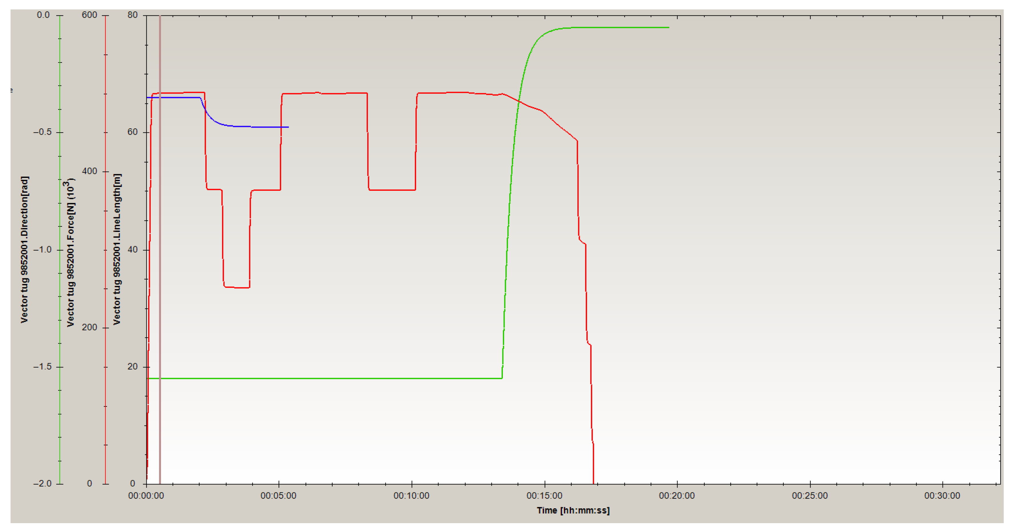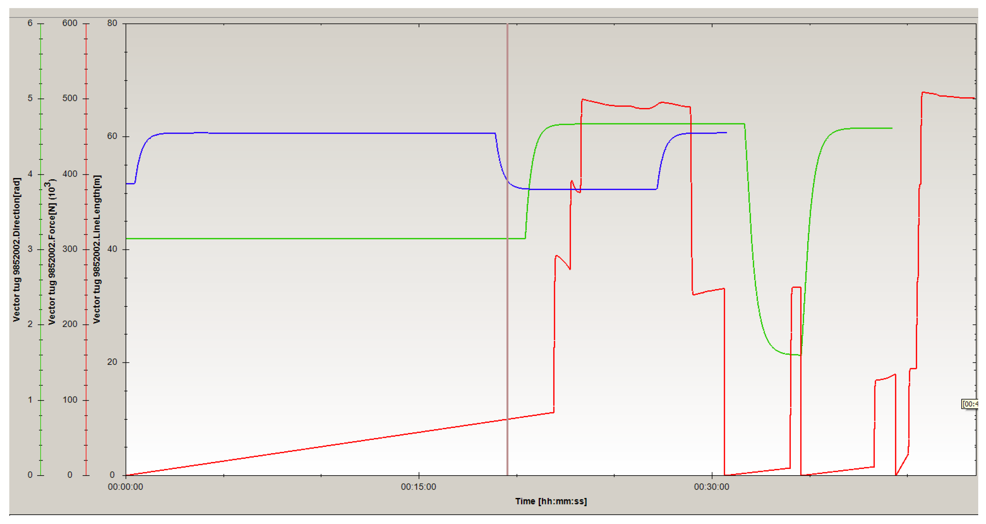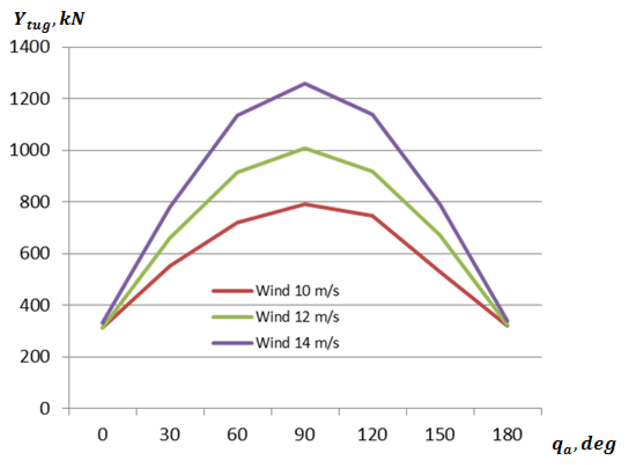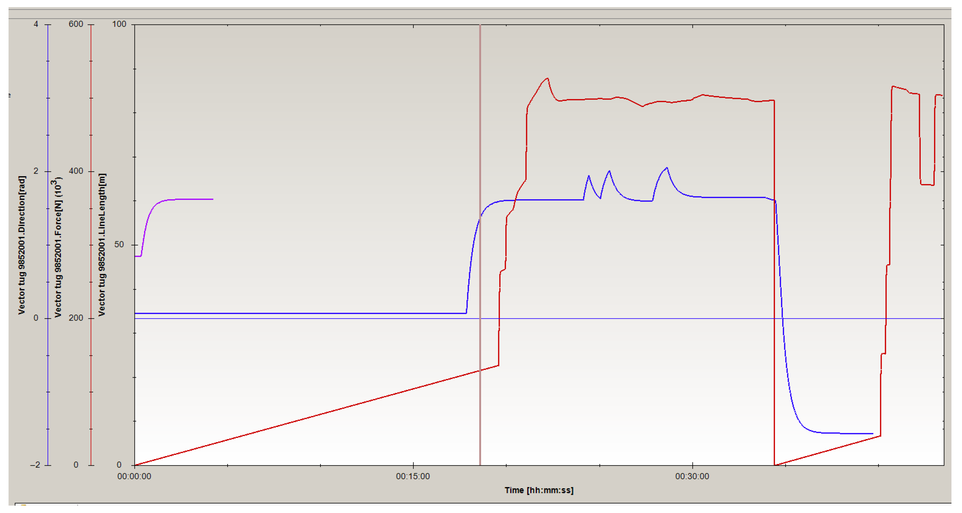 Figure 15. At higher wind and current speeds and in other directions, for the above-mentioned type of ship (NEW PANAMAX container ship) could be necessary to have higher tugboats pulling forces, i.e., three or more tugboats may be used and this information is very important to have when planning the entry or exit of a ship into or out of port.