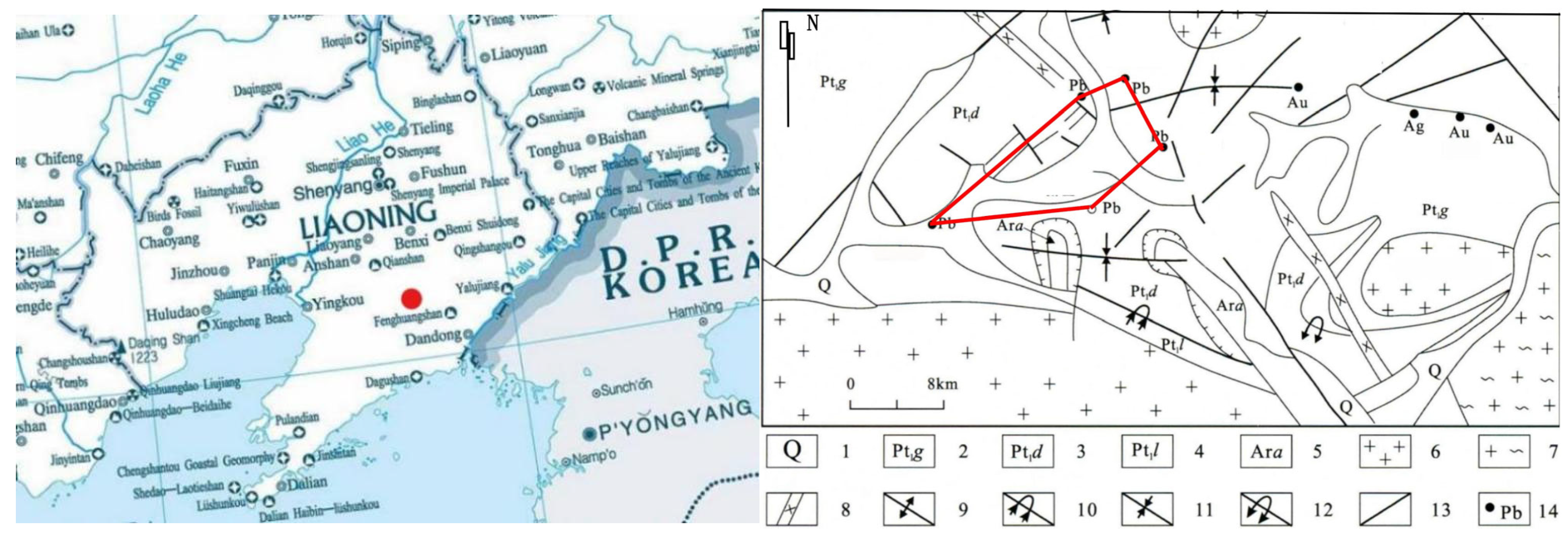- Ma, Y.B.; Xing, S.W.; Zhang, Z.J.; Sun, J.G. Preliminary study of geochemical characteristics of ore-forming fluid in Zhenzigou veined Pb-Zn deposit, Qingchengzi, Liaoning Province. Miner. Depos. 2012, 31, 569–578. [Google Scholar]