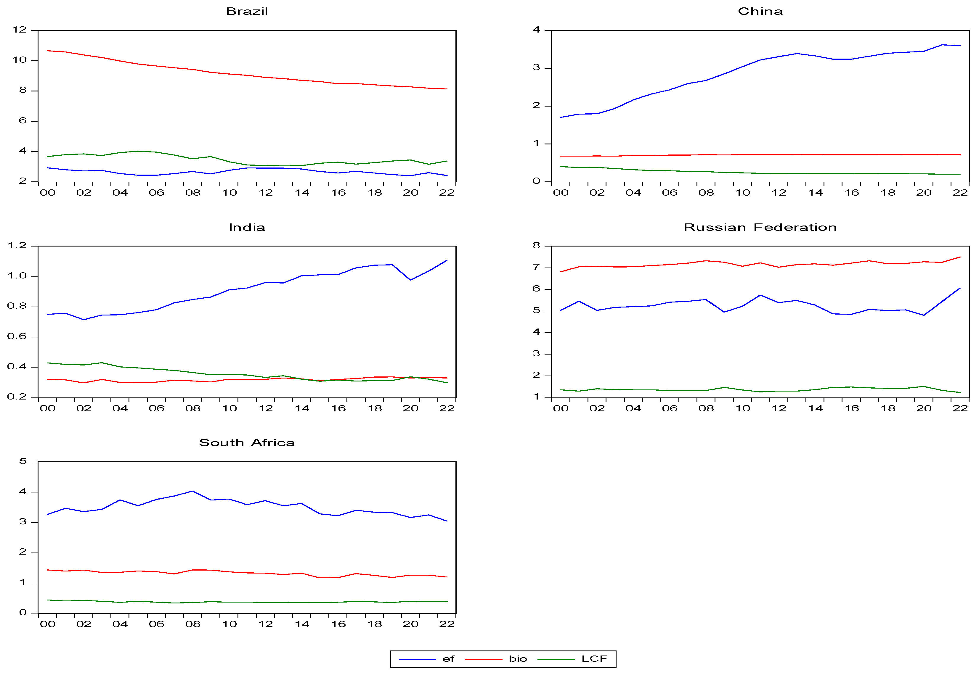 6], which considered BRICS countries. The study shows that forests, which provide habitats for many species, protect biodiversity and ecological balance, and that expanding forest areas will increase environmental benefits and promote the conservation of biodiversity. Despite significant geographical and climatic differences among BRICS countries, a third factor, forest cover, has been included in the study, considering the importance of forest cover as described above. On the path to greening the BRICS countries, the impact of the “forest arena,” which has been overlooked and neglected in previous studies but is essential for sustainability, on environmental quality has been examined.