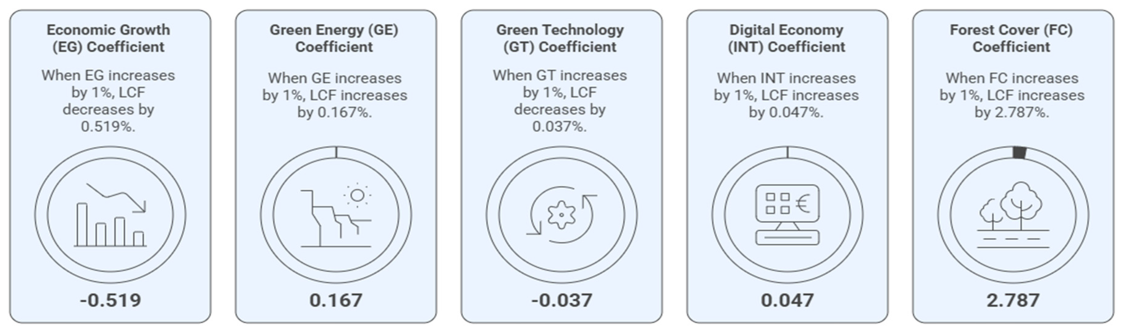 8], who examined BRICS countries. According to this conclusion, firstly, the intermittent operation characteristic inherent in some green energy sources such as solar, hydroelectric, and wind makes it difficult to ensure consistency in energy supply, thus limiting LCF (Low-Consumption Function). Secondly, current technology is insufficient to fully meet energy storage and distribution requirements, leading to imbalances between energy demand and supply and negatively impacting LCF. Similarly, according to [