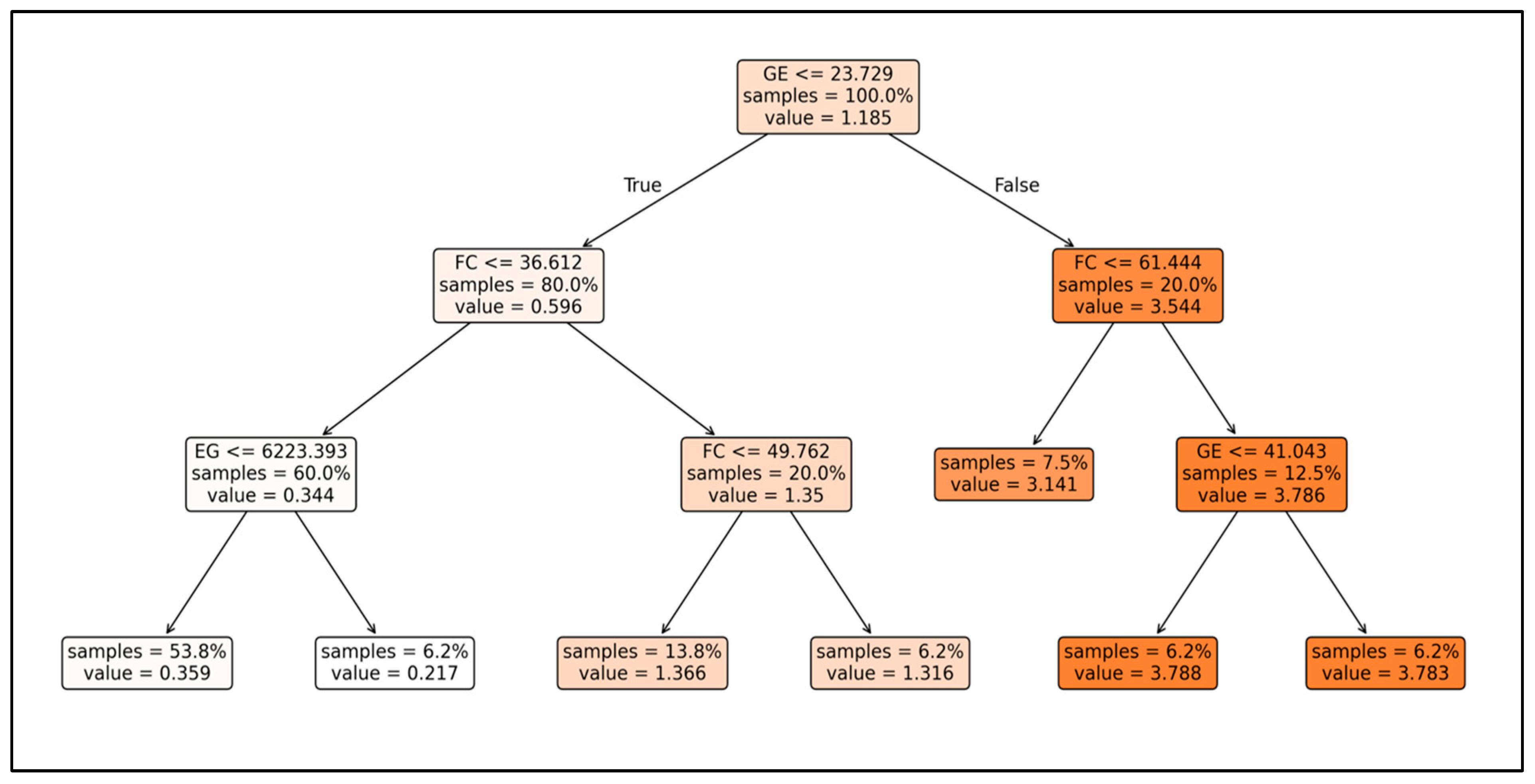 63]. In particular, the superior performance of tree-based and ensemble methods confirms that the LCF (Lower Environmental Capacity Factor), an indicator of environmental quality, has a nonlinear, interactive, and threshold-based structure. These findings are consistent with the results obtained in the econometric section of the study and offer a more detailed perspective on the conditions under which environmental sustainability is strengthened, going beyond average impacts.