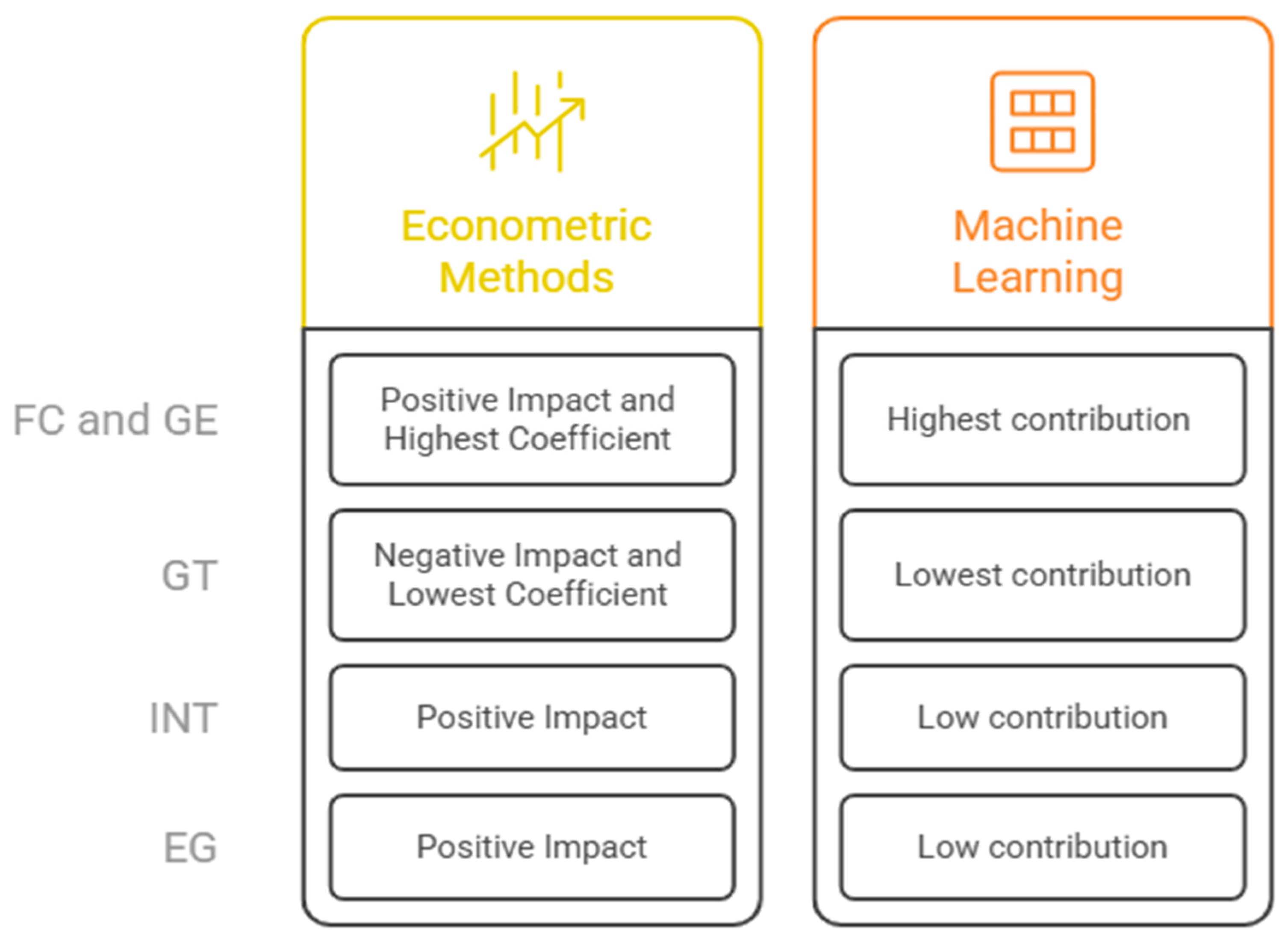 11]. In this study, the performance of different ML algorithms in predicting the load capacity factor was compared; countries were classified as “winners” and “losers” using an ensemble decision tree model. This approach guides policymakers in developing targeted environmental policies and disseminating best practices. The combined use of panel data analysis and ML methods strengthens the methodological contribution of the study and allows for a holistic evaluation of energy, technology, economics, and environmental policies.