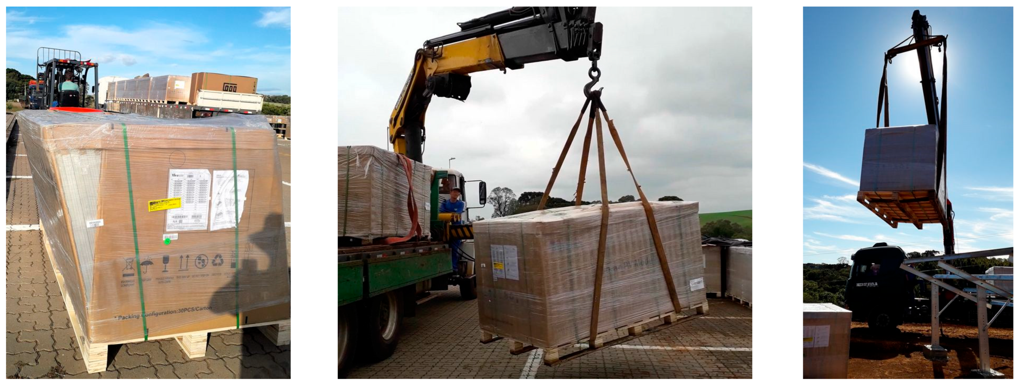 Figure 1 illustrates the logistical challenges associated with transporting new PV modules in Brazil, highlighting the actual work practices of transport and delivery companies. The road infrastructure is in a state of disrepair, and the modules were transported over long distances. The transportation of the materials without glass breakage from the seaport to the laboratory car park at the Federal University of Fronteira Sul Campus, Erechim, approximately 500 km, represents a significant challenge. The lifting was conducted without the use of a lifting rocker. The deformation of the packaging resulted in damage to the aluminum structure of the modules, which was likely a contributing factor for the observed glass breakage. Finally, unloading the PVs onto the ground entailed a risk of collision and tilting of the storage unit.