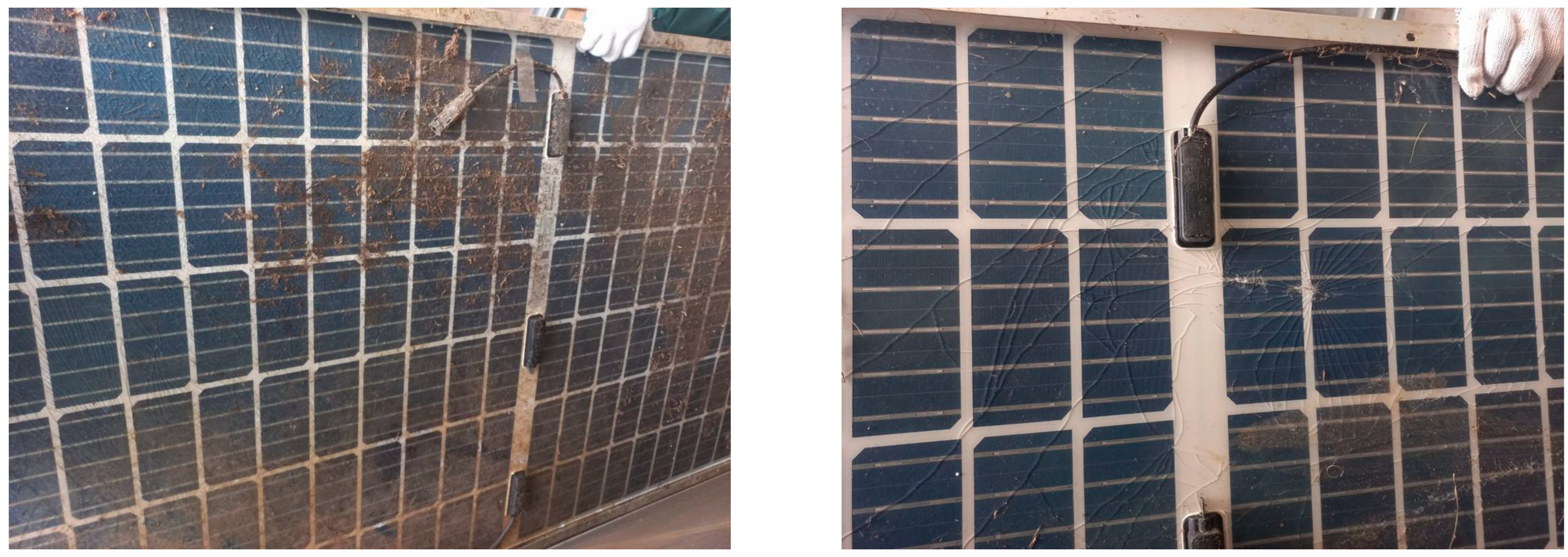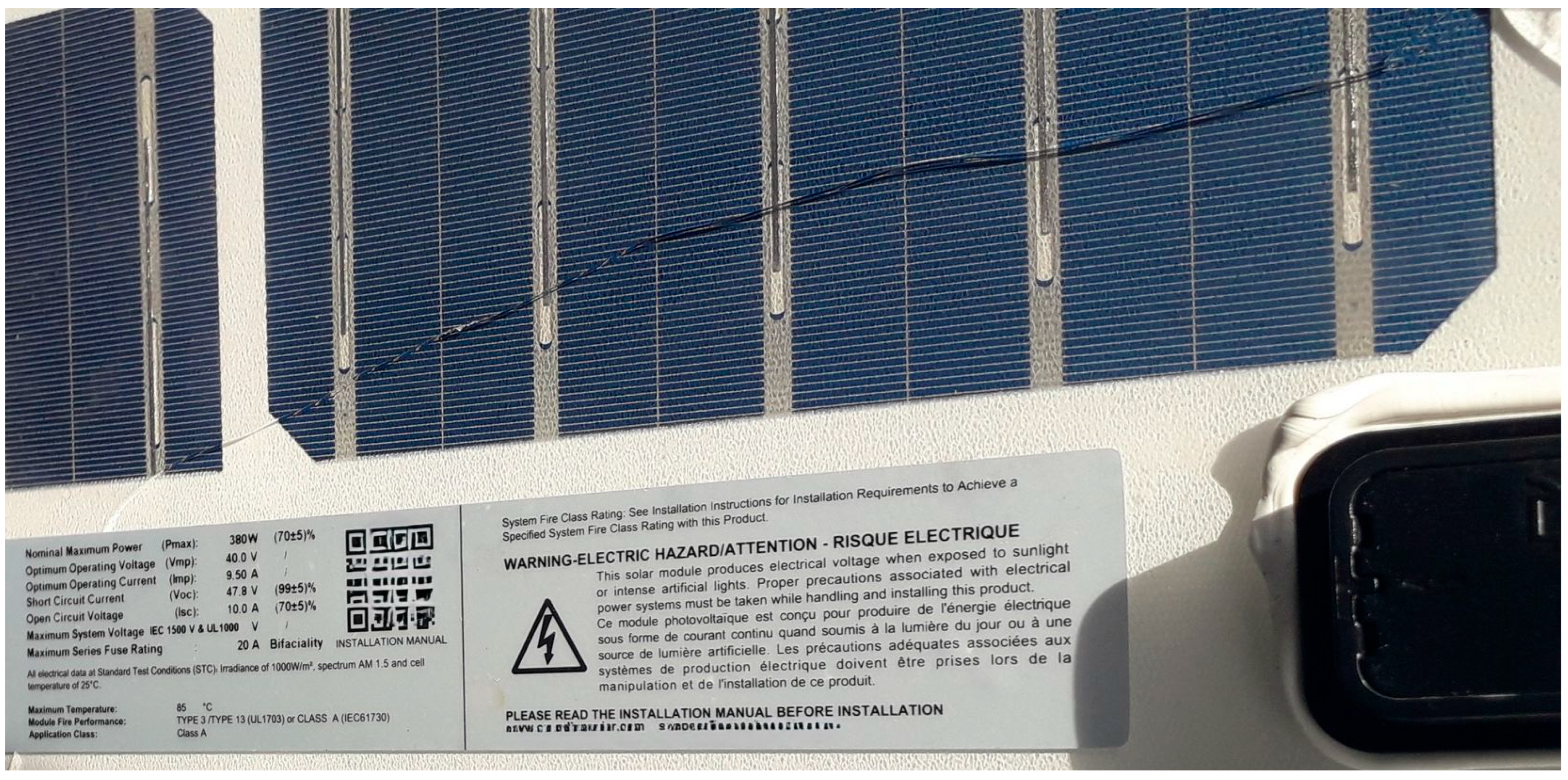 Figure 2 shows the representative condition of the PV modules that were stored following their disposal at the PV plants’ installation sites. All modules originated from the same project and were of a similar model. After checking all modules, the undamaged ones were installed in plants with a combined capacity of 3.45 MWp and 1.4 MWp, comprising over 12,700 modules.