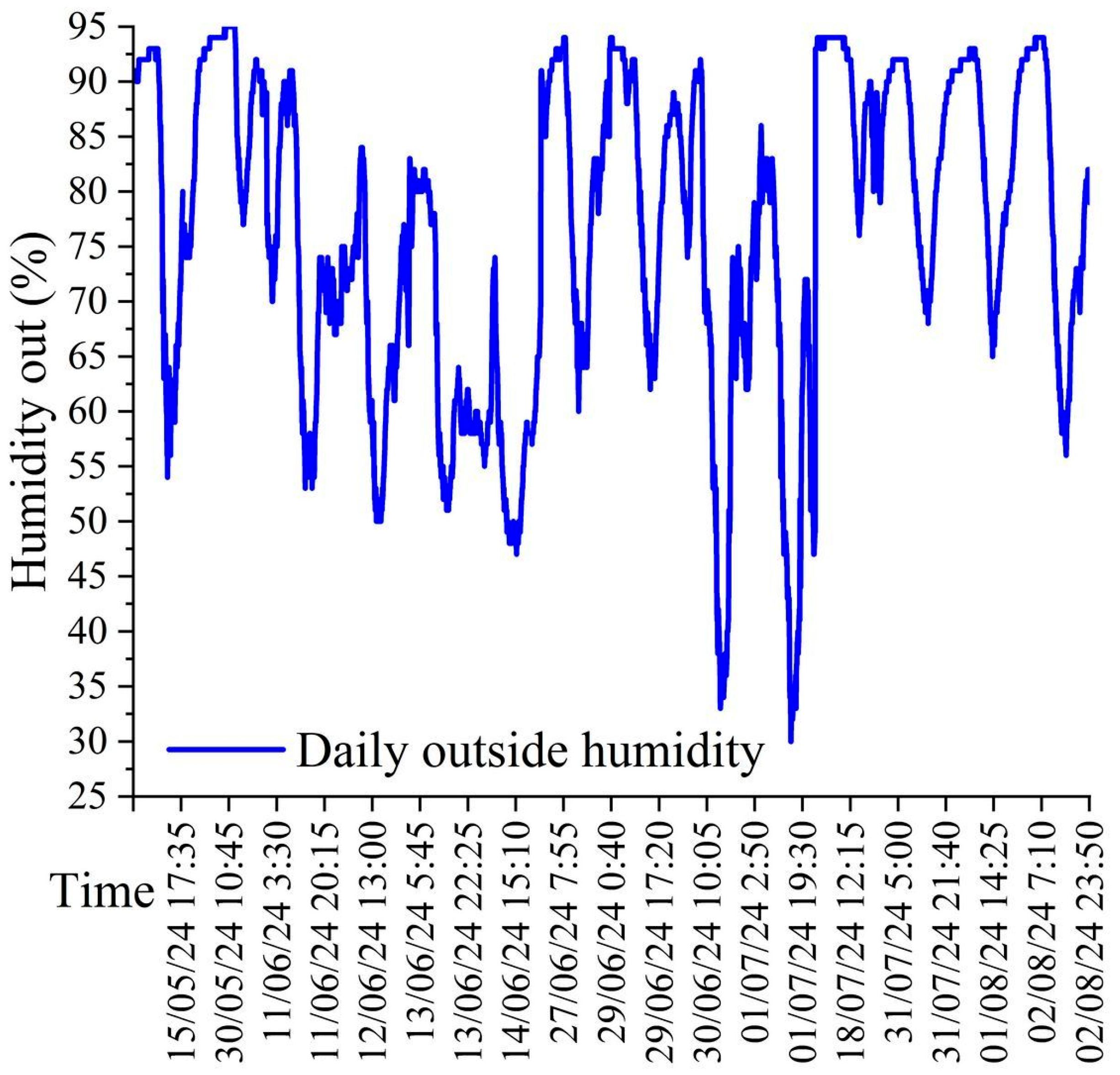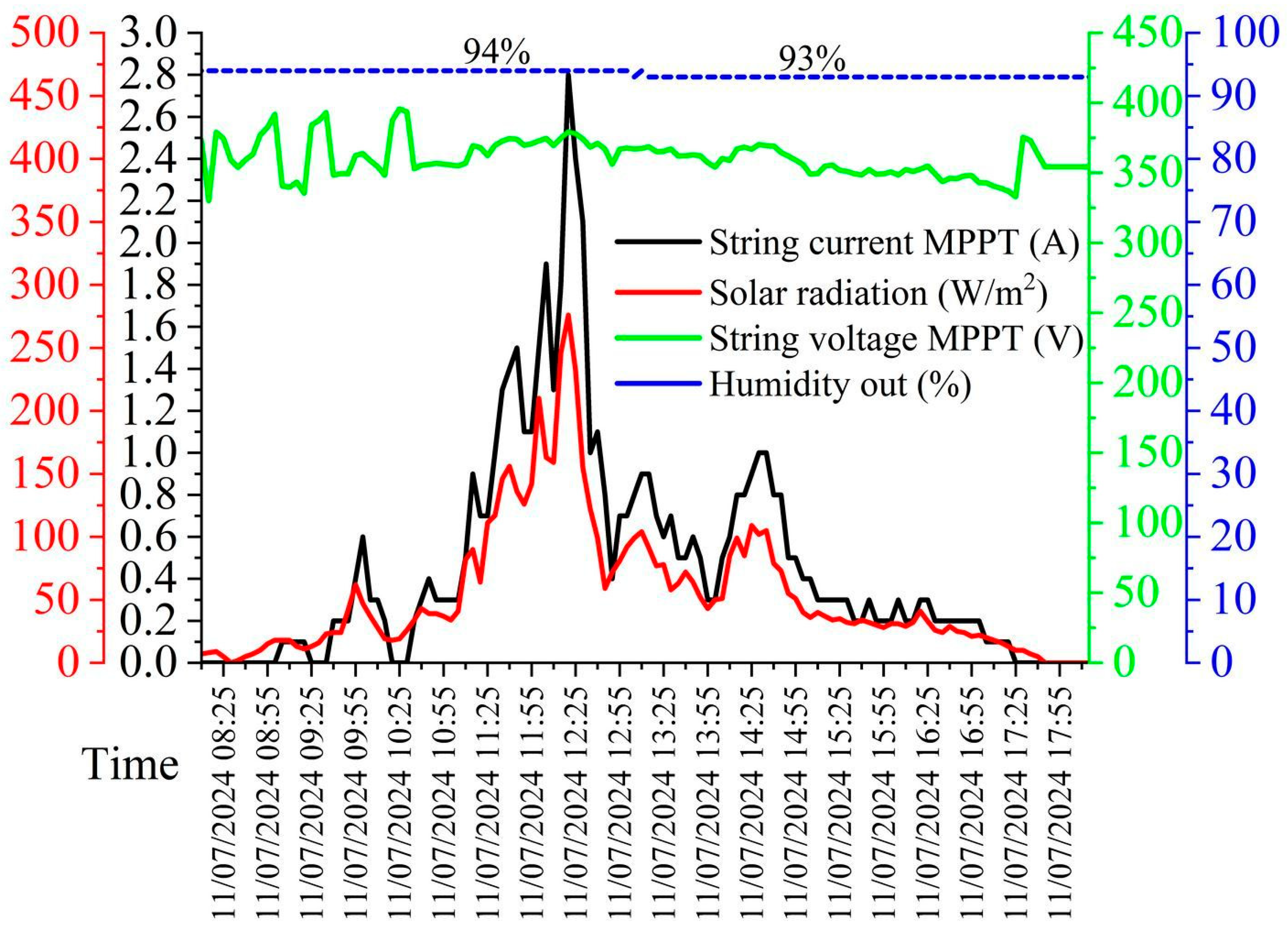 Figure 11 represents the dynamic behavior of solar irradiation and humidity on 11 July 2024. The data were obtained from the Davis Vantage Pro2 weather station, which was installed 30 m from the carport. The day was characterized by precipitation and high humidity, with a humidity level of 94% recorded between 8 a.m. and 6 p.m. Despite low solar irradiation, with a peak of only 276 W/m