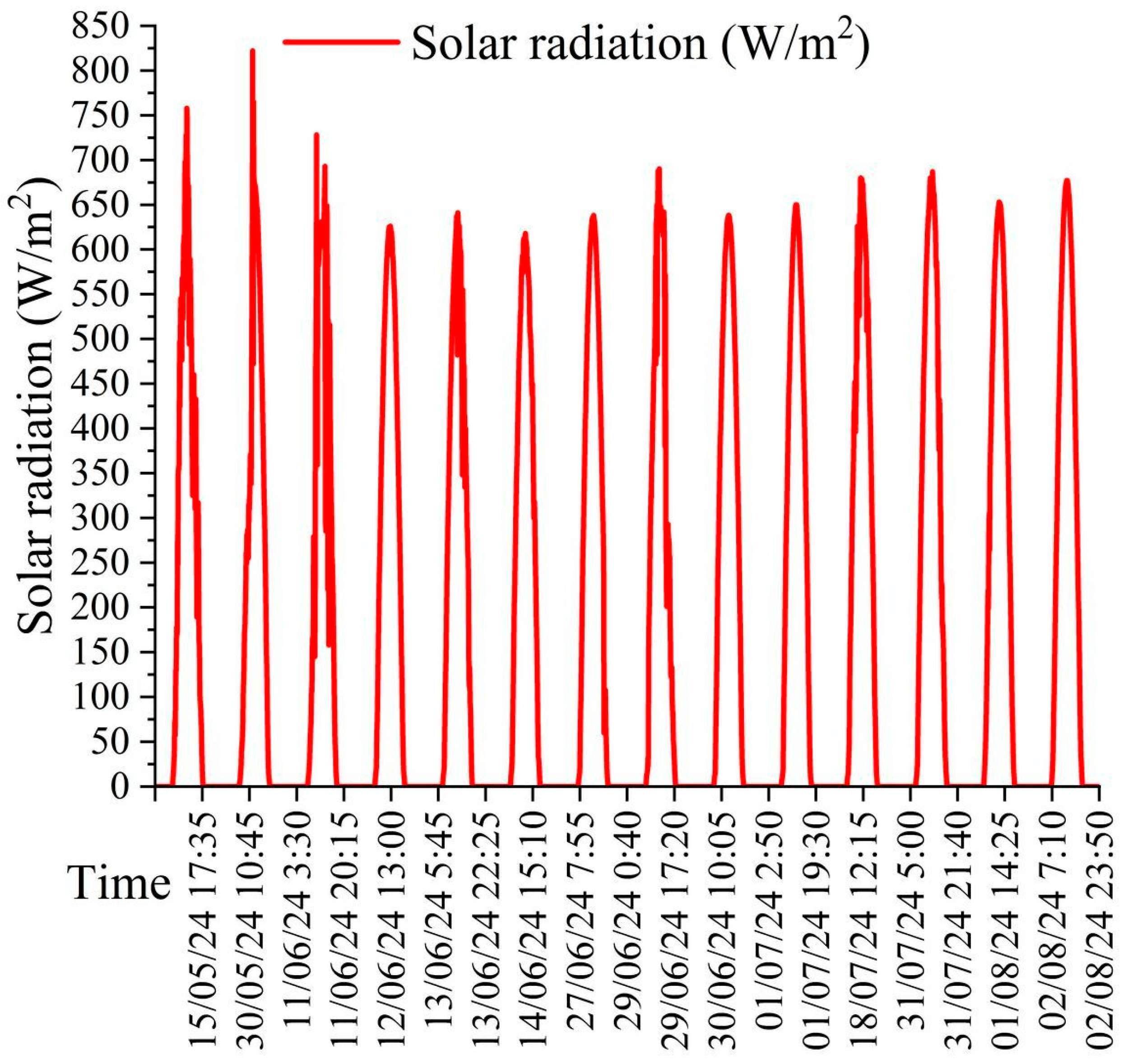 Figure 8 shows the dynamic behavior of solar irradiation, demonstrating that the tests were conducted on days with clear skies and no cloud cover. Despite the high humidity of up to 95%, precipitation was not observed, and any clouds that did exist were sparse and of minimal size. The mean annual global horizontal irradiation is 195 W/m