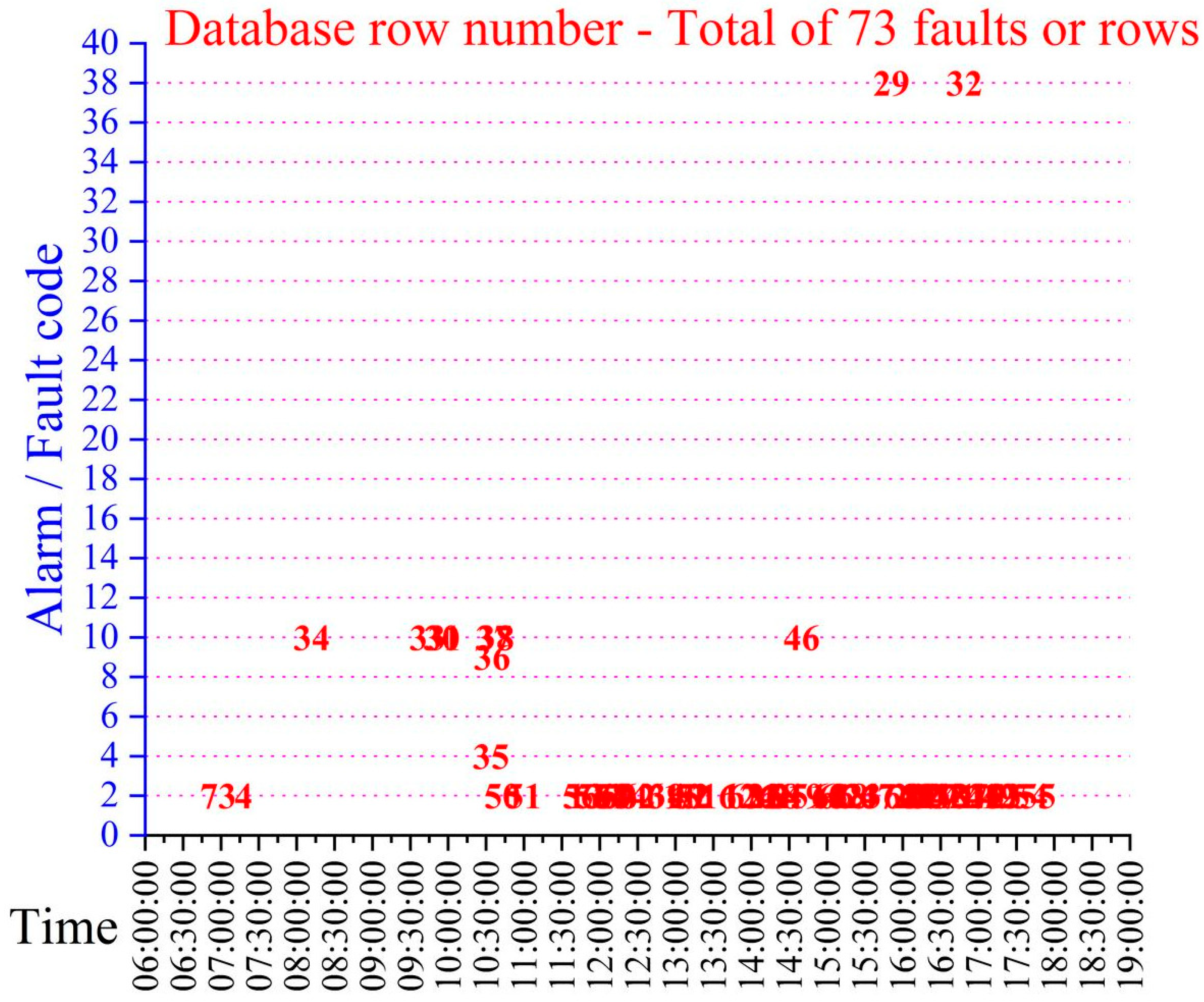The longest interval between the occurrence of a fault and the subsequent recovery of the system was 40 min. In most cases, recovery was observed within a few minutes of the initial event. The required recovery time depends on the prevailing conditions of the electricity network. The weather conditions, the presence or absence of clouds, and the time of day at which the alarm is triggered are also factors that influence the speed of recovery. For instance, if the alarm occurs in the late afternoon, recovery may not occur until the following day.