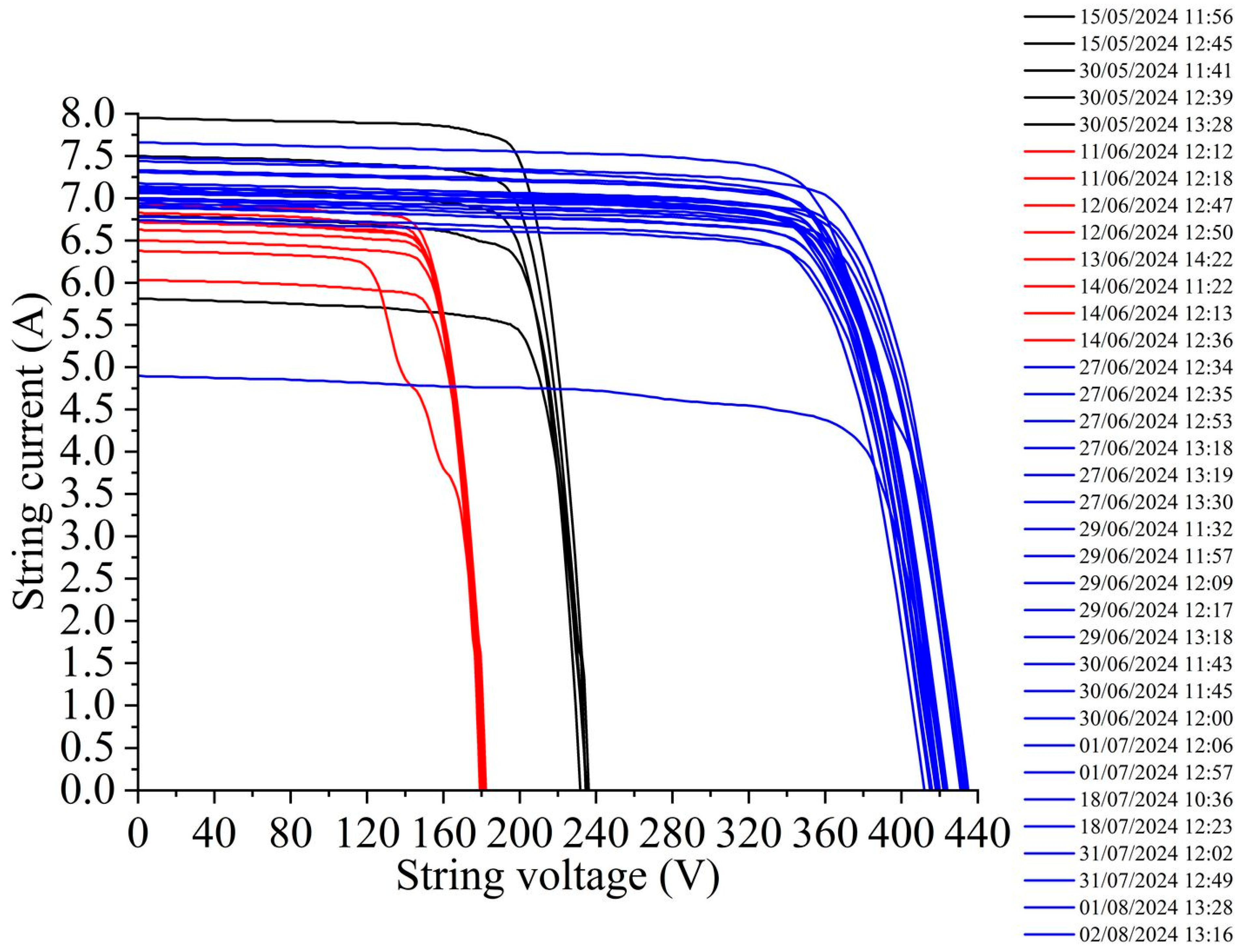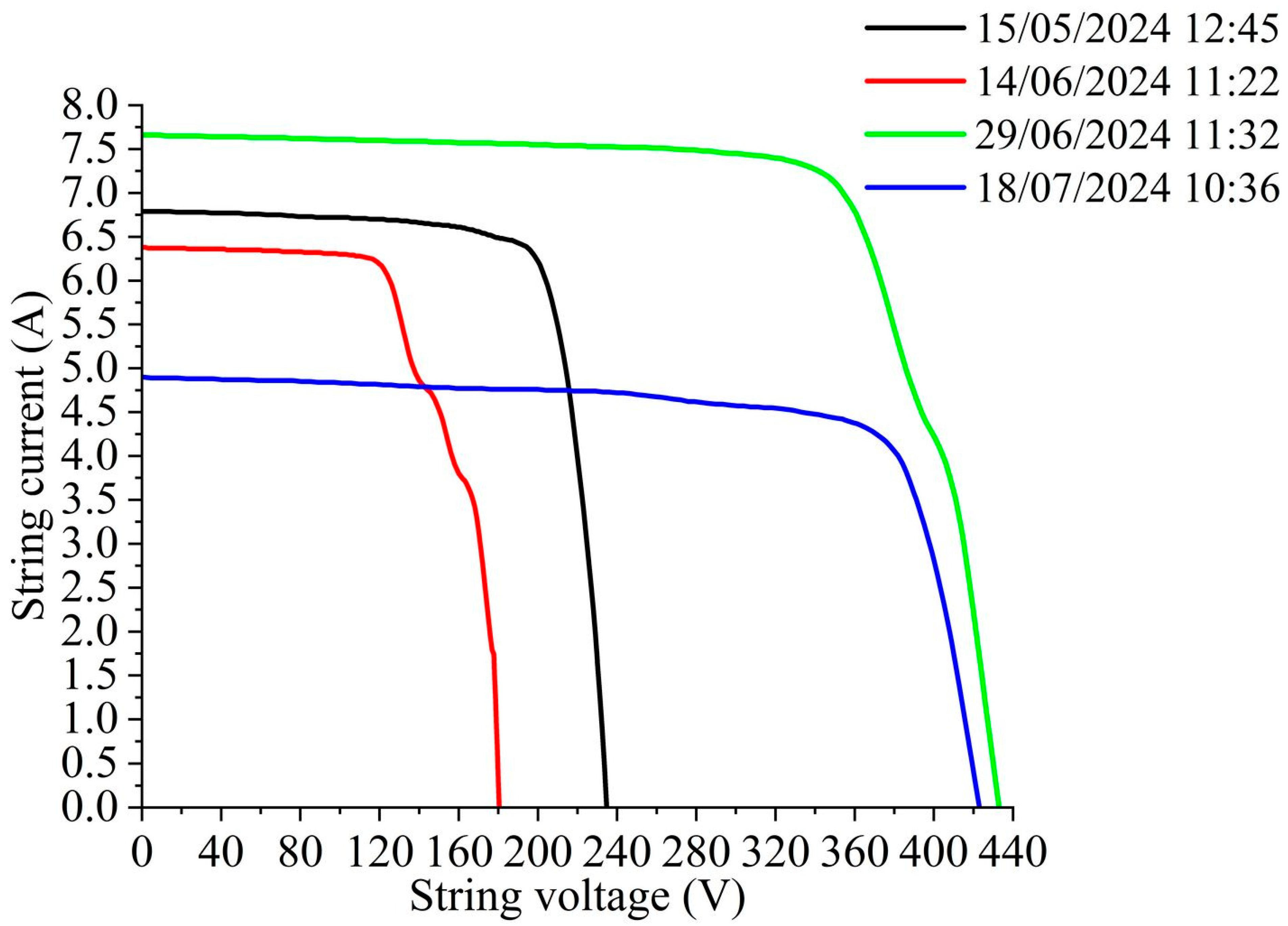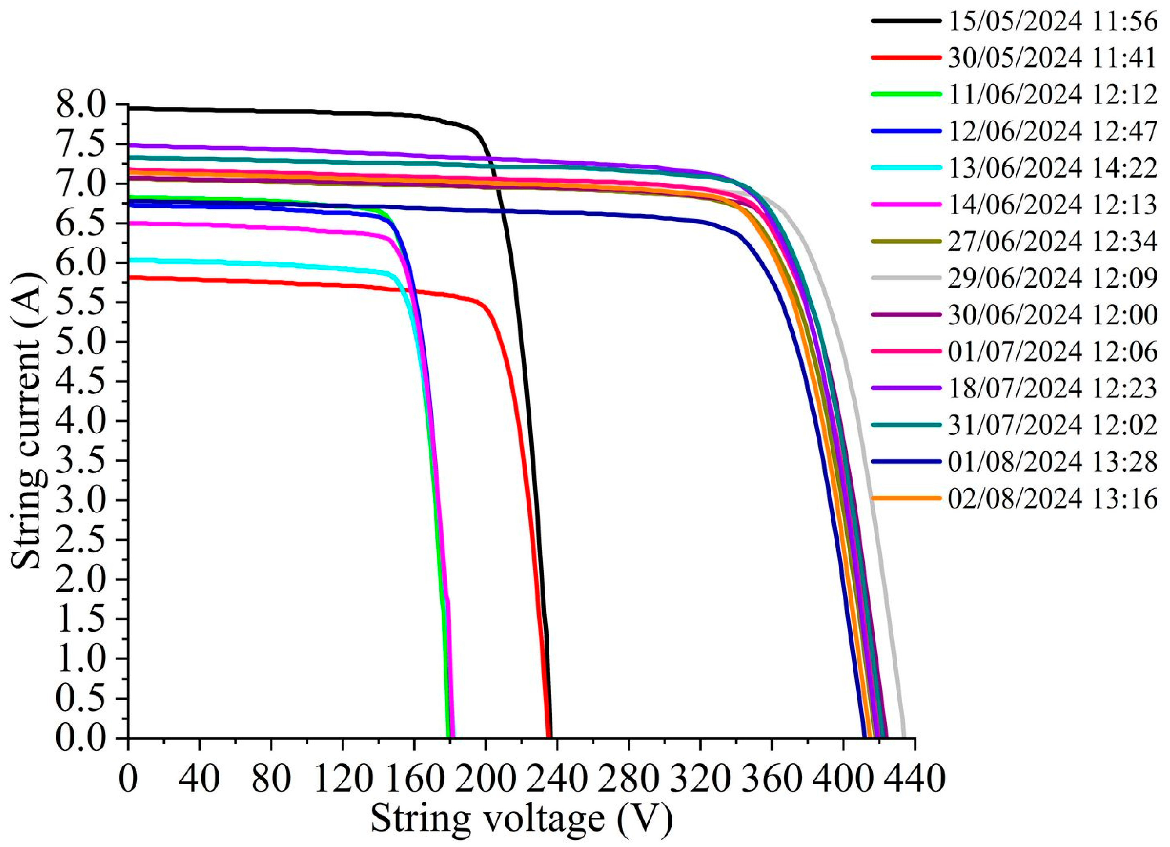 Figure 12 illustrates the dynamic behavior of the thirty-six I-V curves generated over the fourteen test days. The nine modules installed in the carport were originally divided into two strings due to the utilization of the SG5K-D inverter. During the tests, which were from 5 January 2024 to 4 June 2024, the SG3.0RS-S inverter remained connected to string 1, which consisted of five modules in series. This configuration is equivalent to the open-circuit voltage value in STC (the standard test conditions (CS3U-380MB-AG) yielded an open-circuit voltage value of V