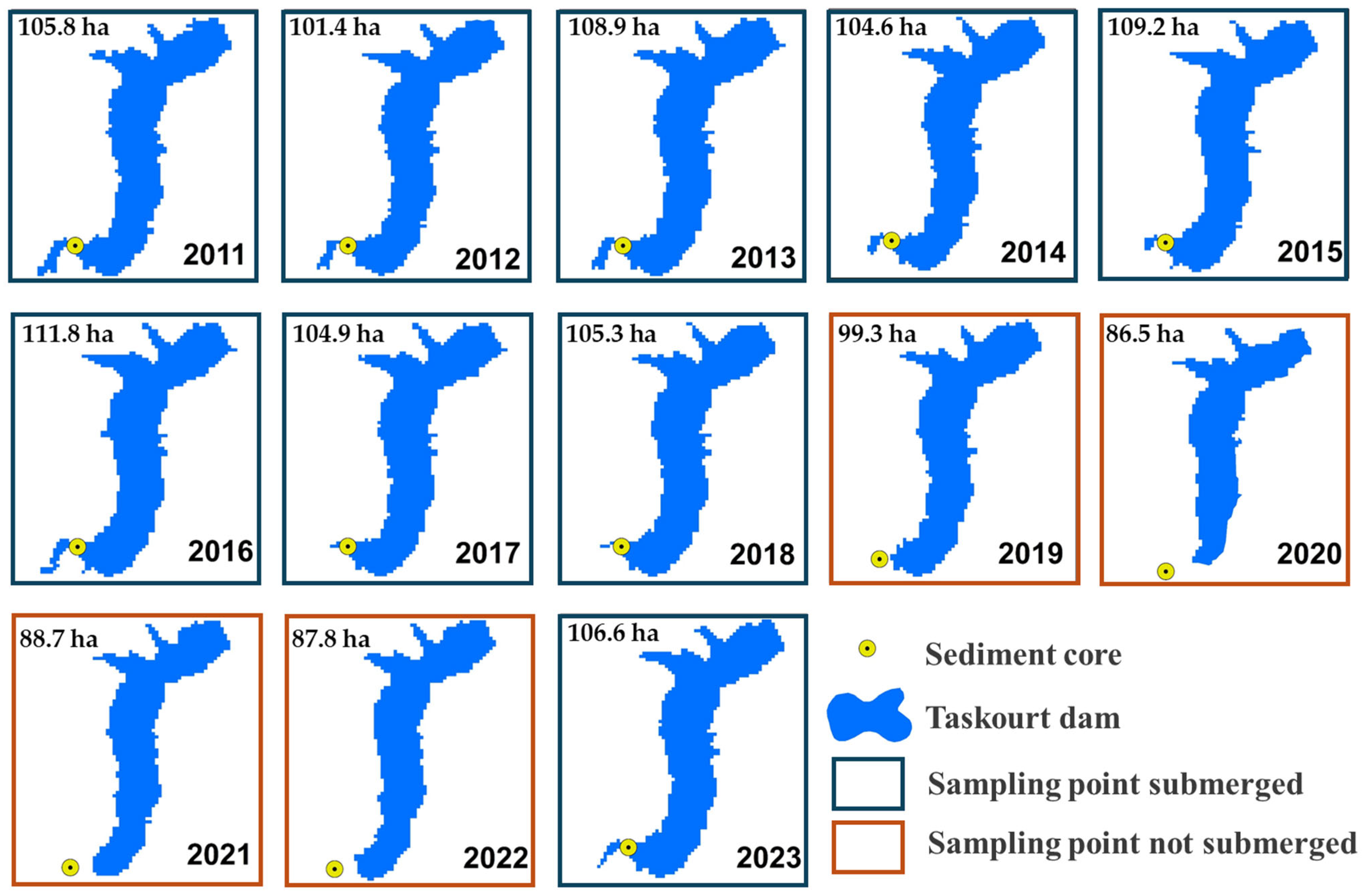 - Mosaid, H.; Barakat, A.; Bouras, E.H.; Ismaili, M.; El Garnaoui, M.; Abdelrahman, K.; Kahal, A.Y. Dam Siltation in the Mediterranean Region Under Climate Change: A Case Study of Ahmed El Hansali Dam, Morocco. Water 2024, 16, 3108. [Google Scholar] [CrossRef]
