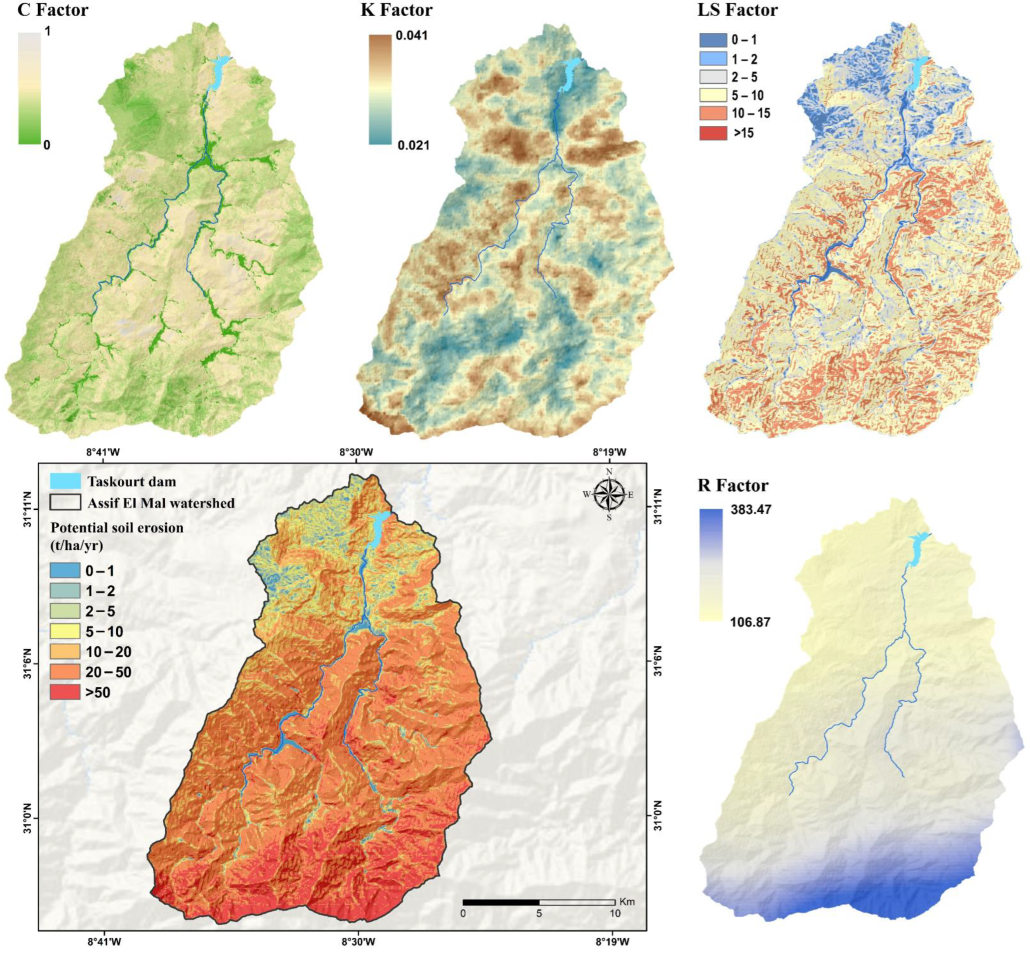 - Oudchaira, S.; Rhoujjati, A.; Hanich, L.; EL Hachimi, M.L. Evaluating Soil Loss and Sediment Yield for Sustainable Management of the Hassan II Dam within Morocco’s Upper Moulouya Watershed Using RUSLE Model and GIS. Environ. Earth Sci. 2024, 83, 210. [Google Scholar] [CrossRef]