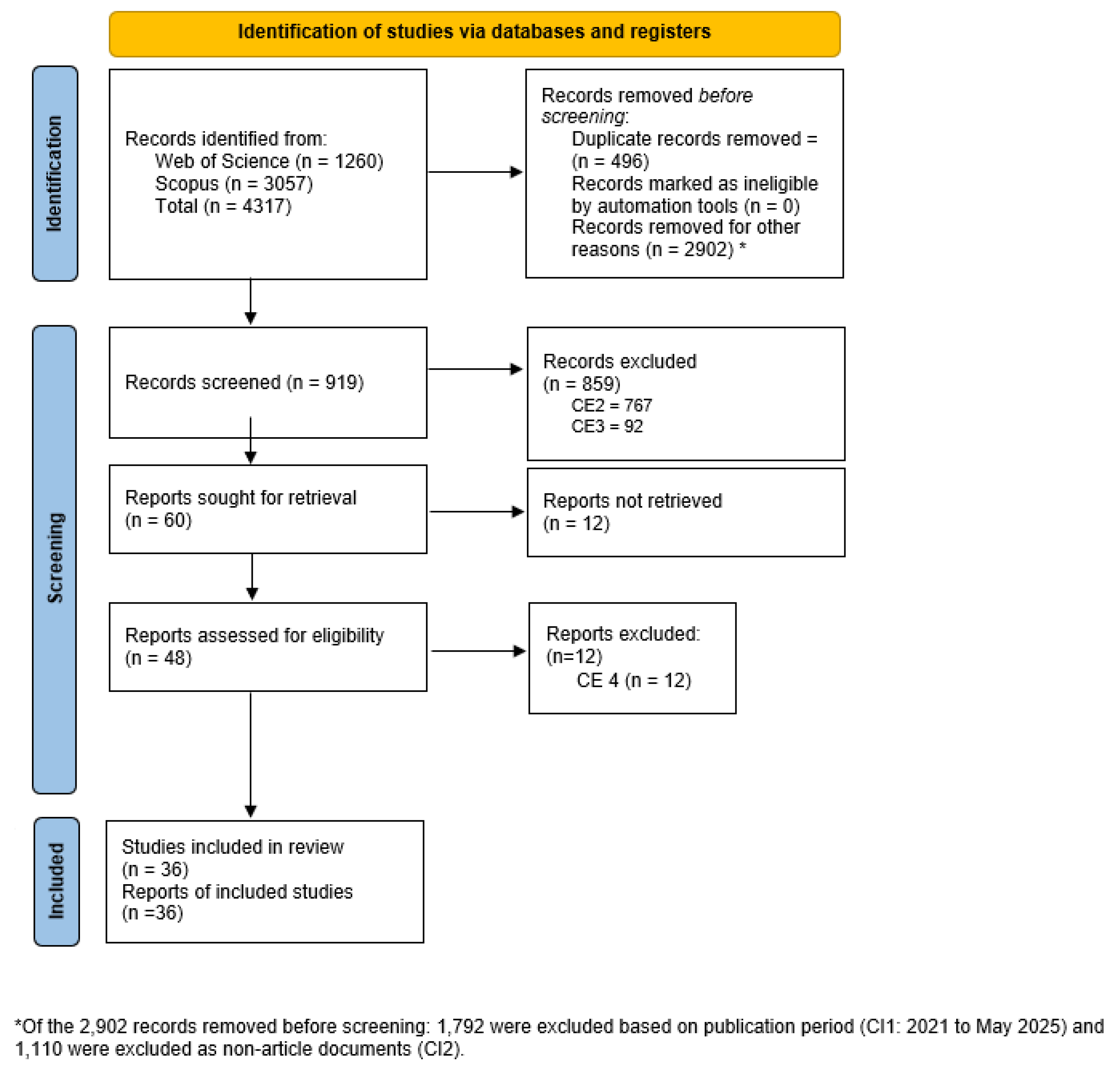 This section presents a detailed quantitative analysis of the 36 selected studies, exploring essential bibliometric indicators including temporal evolution of publications, geographical distribution of authors, predominant themes, and profile of scientific vehicles. The analyzed corpus comprises documents published between 2021 and 2025, evidencing the contemporary character of research on Business Intelligence, Big Data Analytics, and sustainable practices in educational management across diverse contexts. Quantitative analysis constitutes a fundamental element for understanding the structural characteristics of scientific production in the area, enabling the identification of collaboration patterns, growth trends, and thematic concentrations that orient field development.