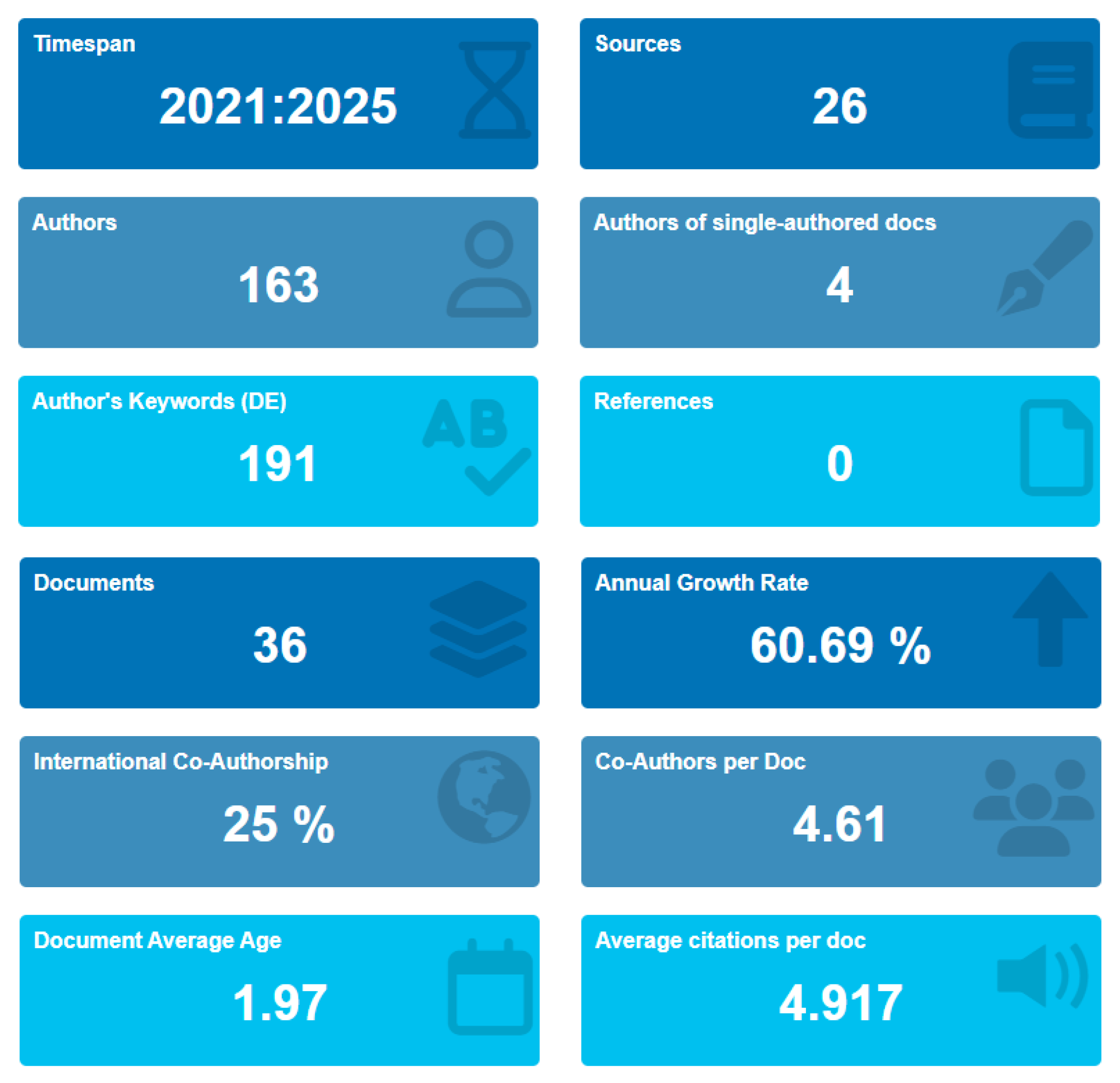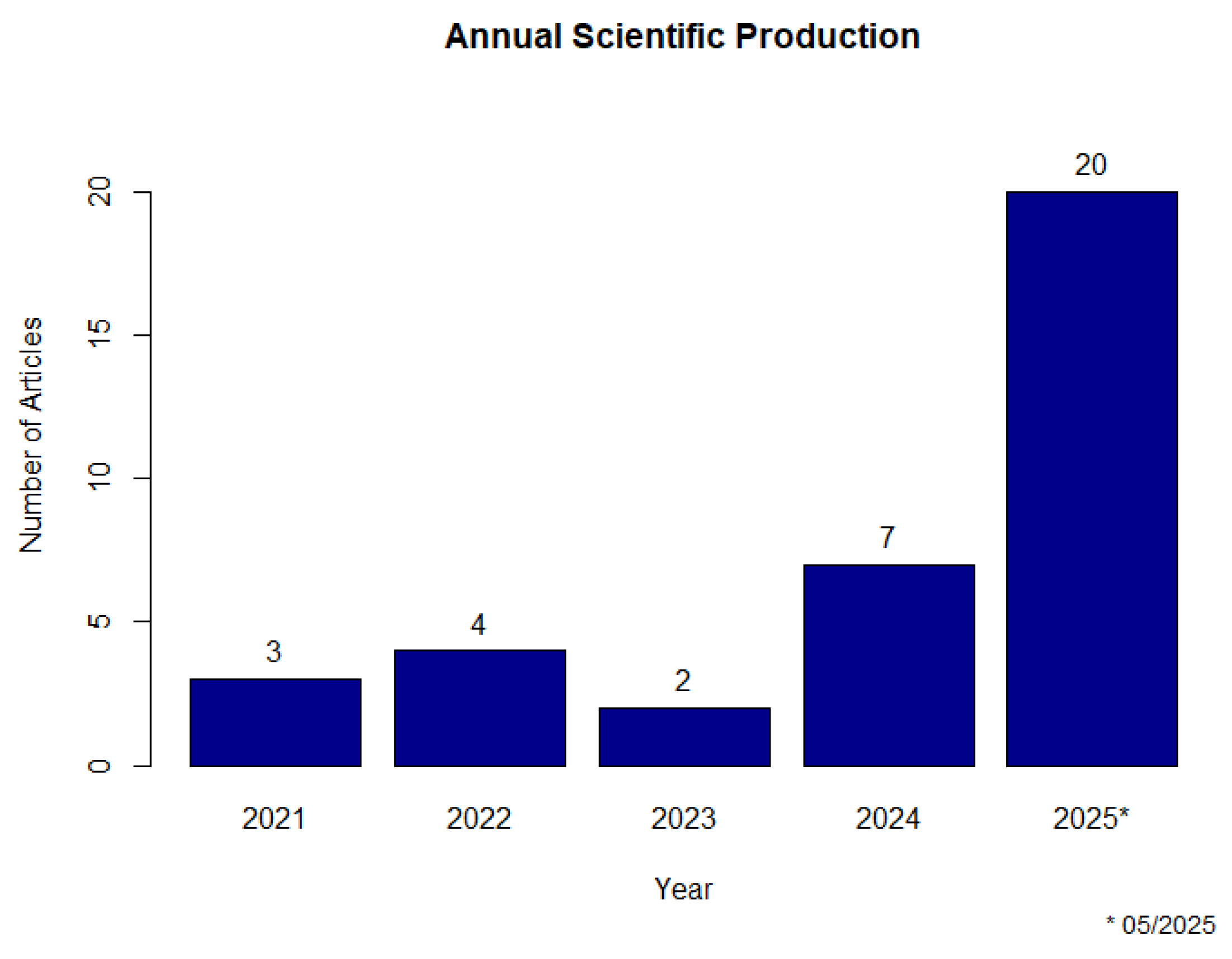 The primary bibliometric indicators reveal structural characteristics of the analyzed scientific production. The five-year period (2021–2025) presents an expressive annual growth rate of 60.69%, indicating rapid and recent emergence of publications in this specific area. This accelerated growth reflects both increasing interest in the application of Business Intelligence and data analysis in educational contexts and the gradual consolidation of this emerging research domain. The average document age of merely 0.972 years confirms the extreme contemporaneity of the corpus, positioning it at the frontier of current scientific knowledge. This indicator reinforces the emerging nature of the investigative field and justifies the necessity of studies that systematize knowledge produced thus far.