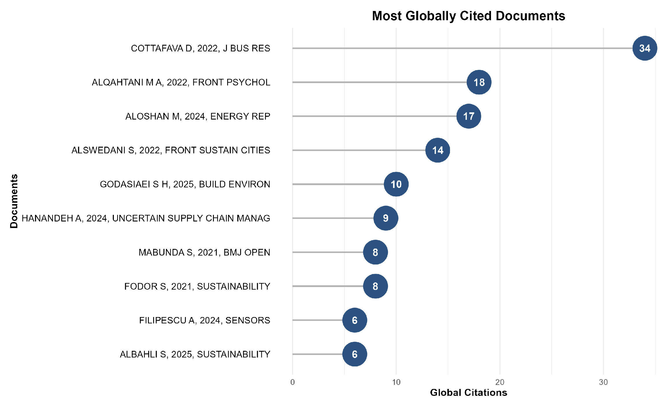 Figure 6 highlights the most globally cited documents and reveals significant patterns of academic recognition. The study by [