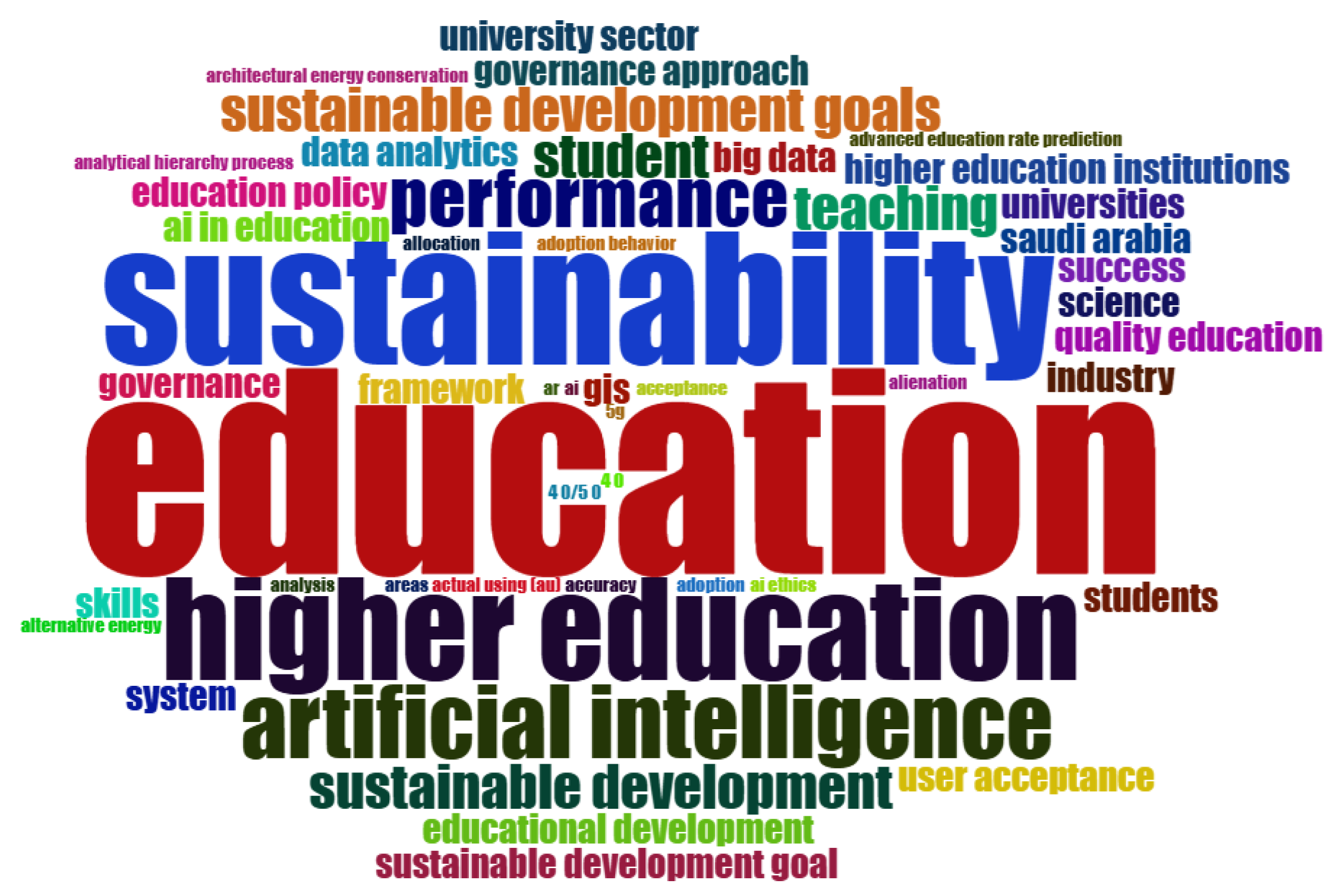A third conceptual stratum is observed formed by “performance” (4 occurrences), complemented by “student,” “sustainable development,” “sustainable development goals,” and “teaching” (3 occurrences each), configuring the triad characterizing practical applications of the area: evaluation of institutional performance, focus on the student as the center of the formative process, explicit alignment with Sustainable Development Goals, and the pedagogical dimension of teaching practice. The presence of “AI in education” (2 occurrences) reinforces the specificity of artificial intelligence application in educational context as an emerging area of academic interest.