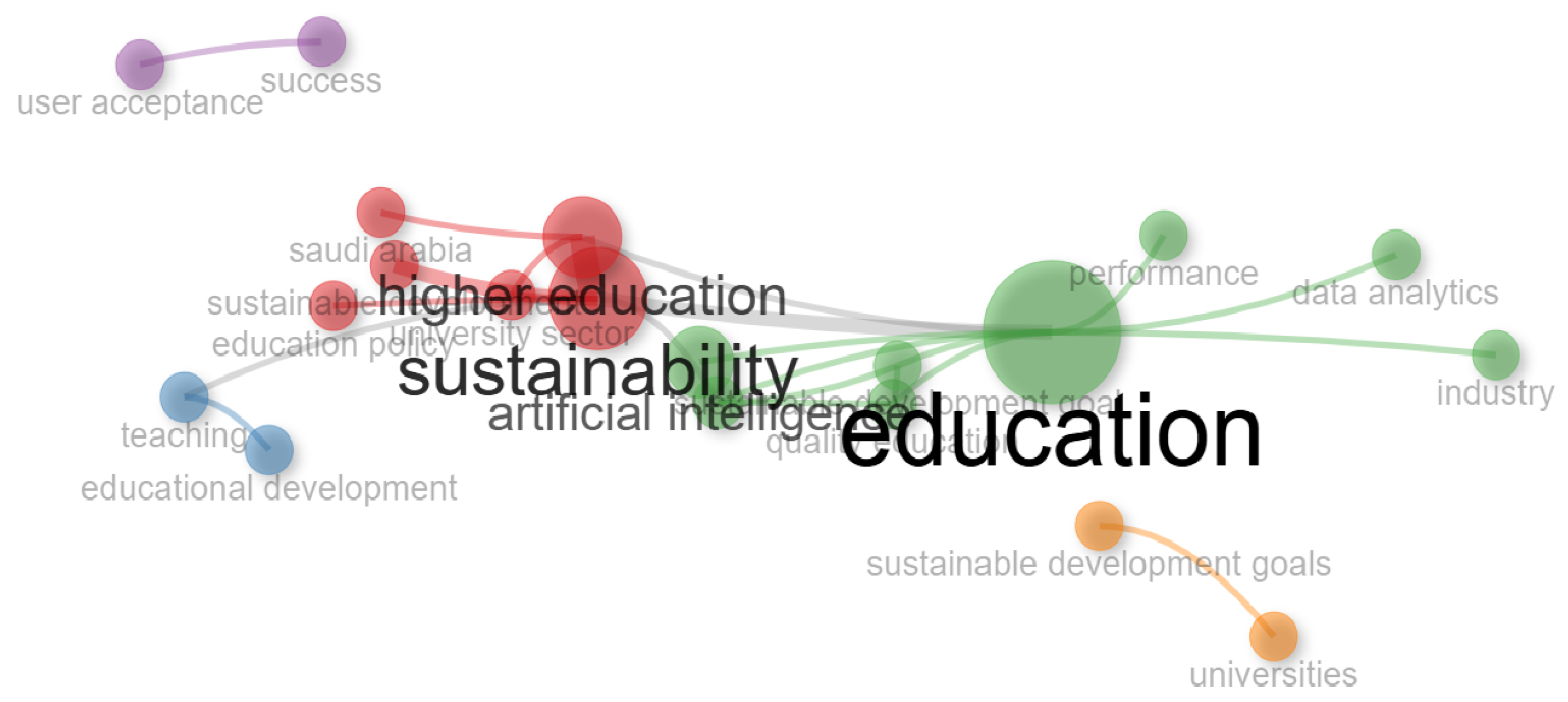 The blue cluster concentrates on practical pedagogical dimension, bringing together “teaching” and “educational development,” focusing on concrete pedagogical practices and broad efforts for improving learning processes and outcomes, reflecting the applied instructional side of educational research. The orange cluster, in turn, establishes direct linkage between academic institutions and global sustainability agenda through the terms “sustainable development goals” and “universities.” The purple cluster, relatively isolated, articulates “user acceptance” and “success,” pertinent to adoption and effectiveness of new technologies, systems, or educational practices.