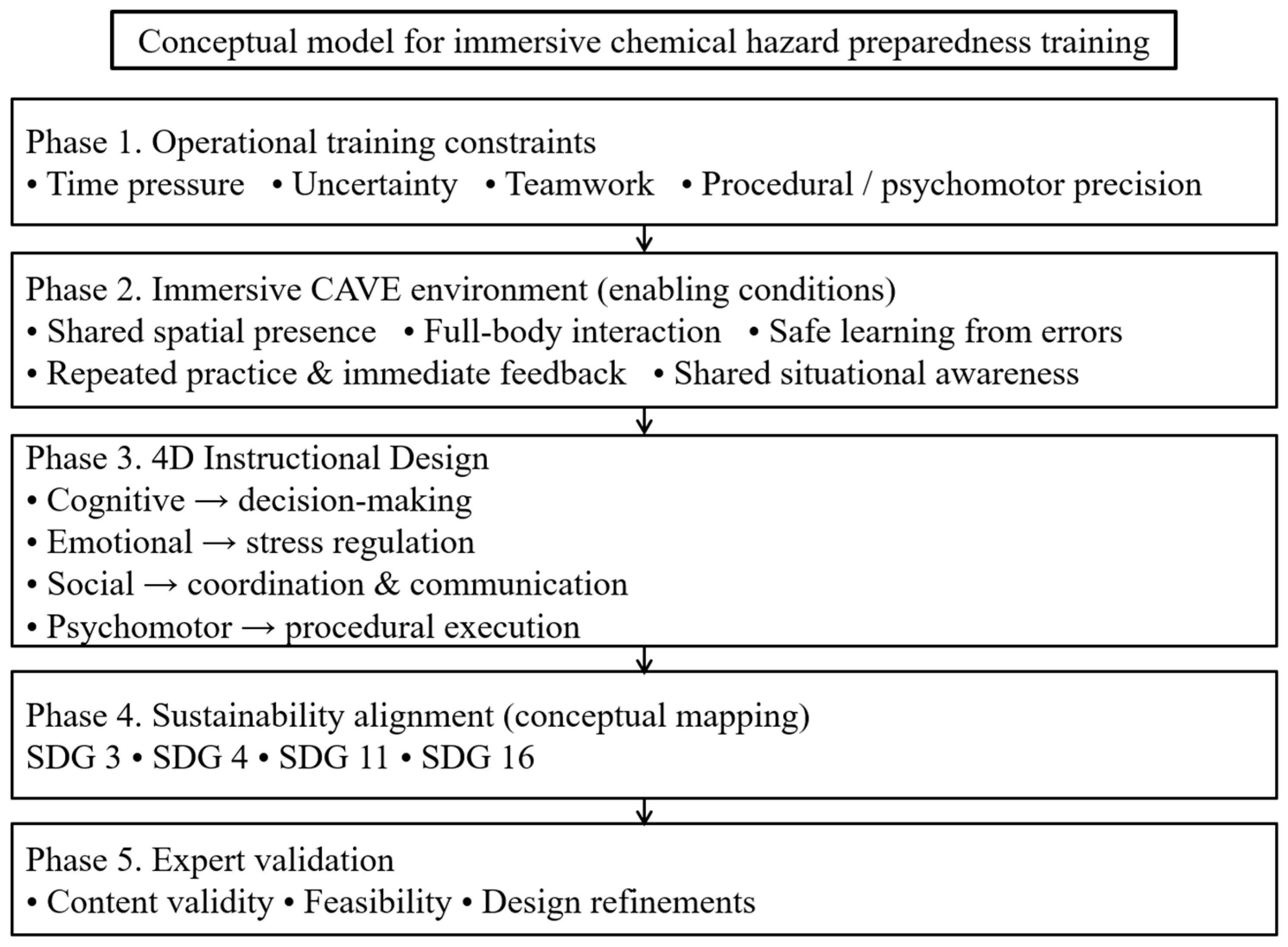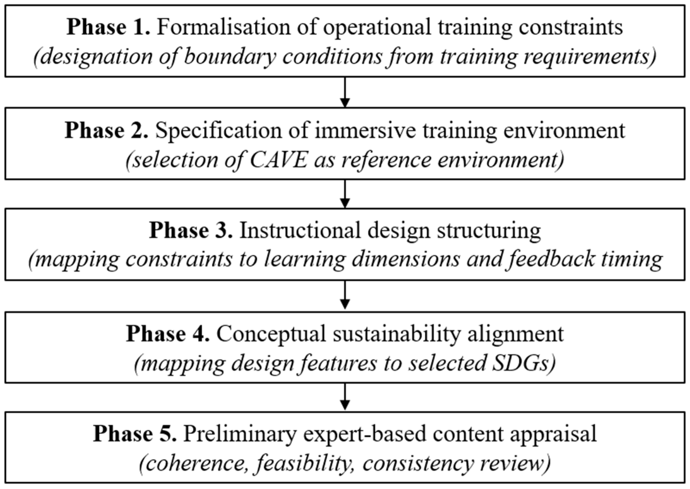 Model development followed a five-phase design-oriented process comprising: (1) formalisation of operational training constraints (boundary conditions designated from training requirements), (2) specification of the immersive training environment, (3) instructional design structuring, (4) conceptual alignment with Sustainable Development Goals, and (5) preliminary expert appraisal (content review).