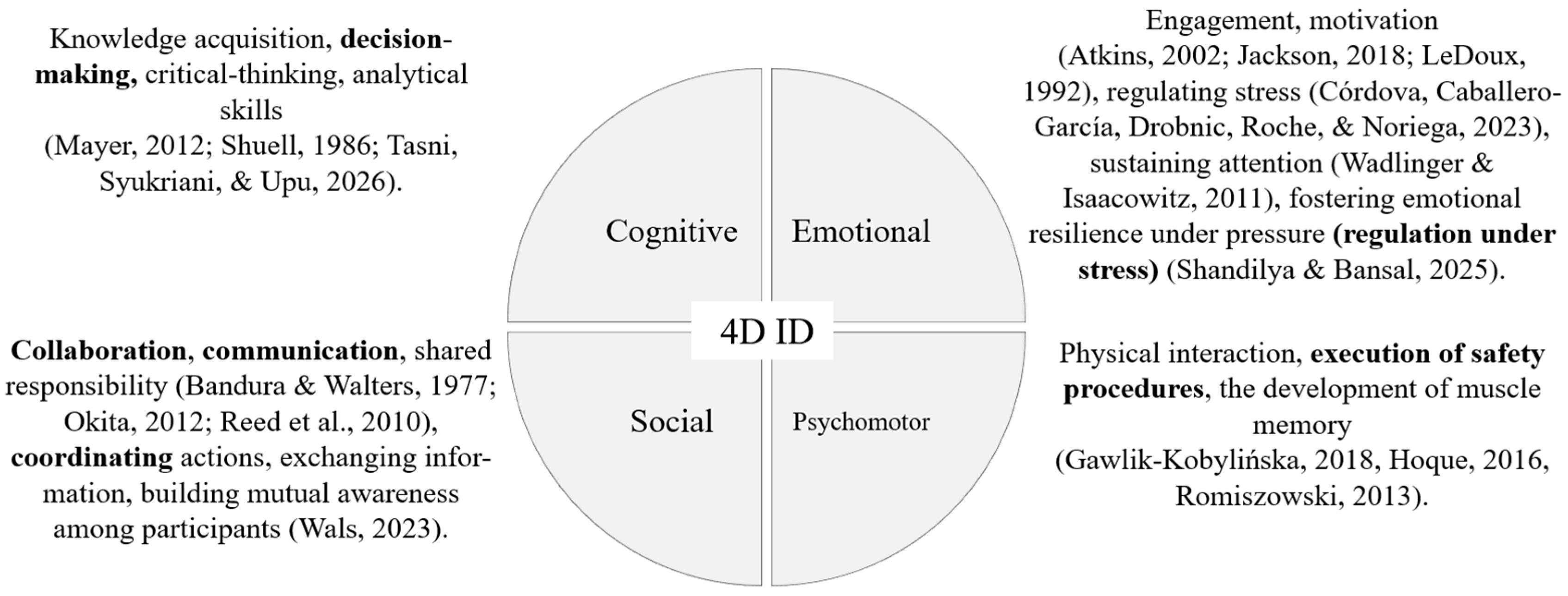 Instructional design decisions were formulated to align learning activities with both the operational training requirements and the affordances of the immersive environment. The model adopts a four-dimensional instructional structure integrating cognitive, emotional, social, and psychomotor learning processes. The structure reflects the interdependence of decision-making, stress management, teamwork, and embodied procedural execution in chemical hazard response training.