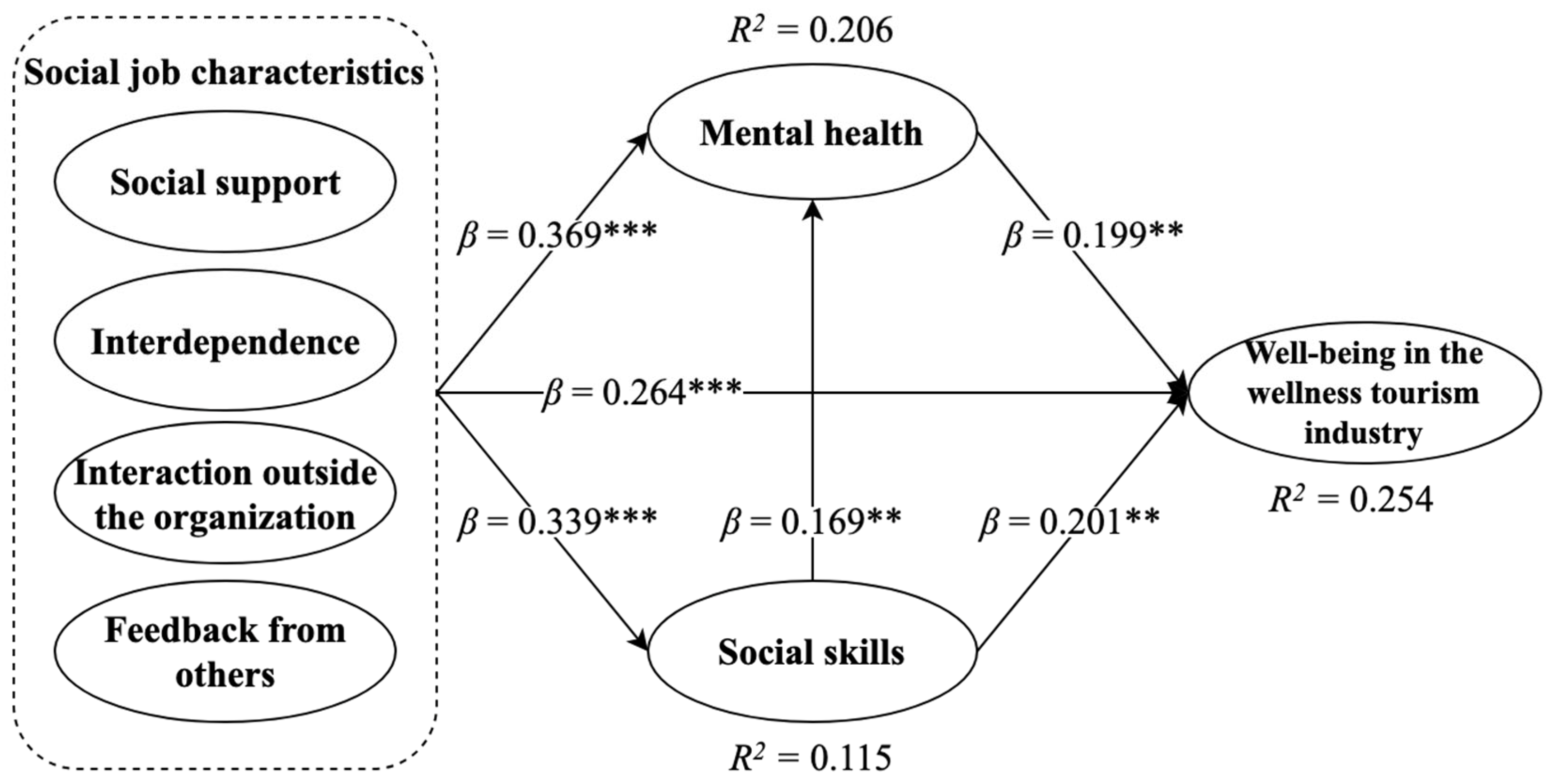 | SJC → MH →WB (Indirect effect 1) | 0.087 (0.010 **) | [0.033, 0.169] | Partial mediation |