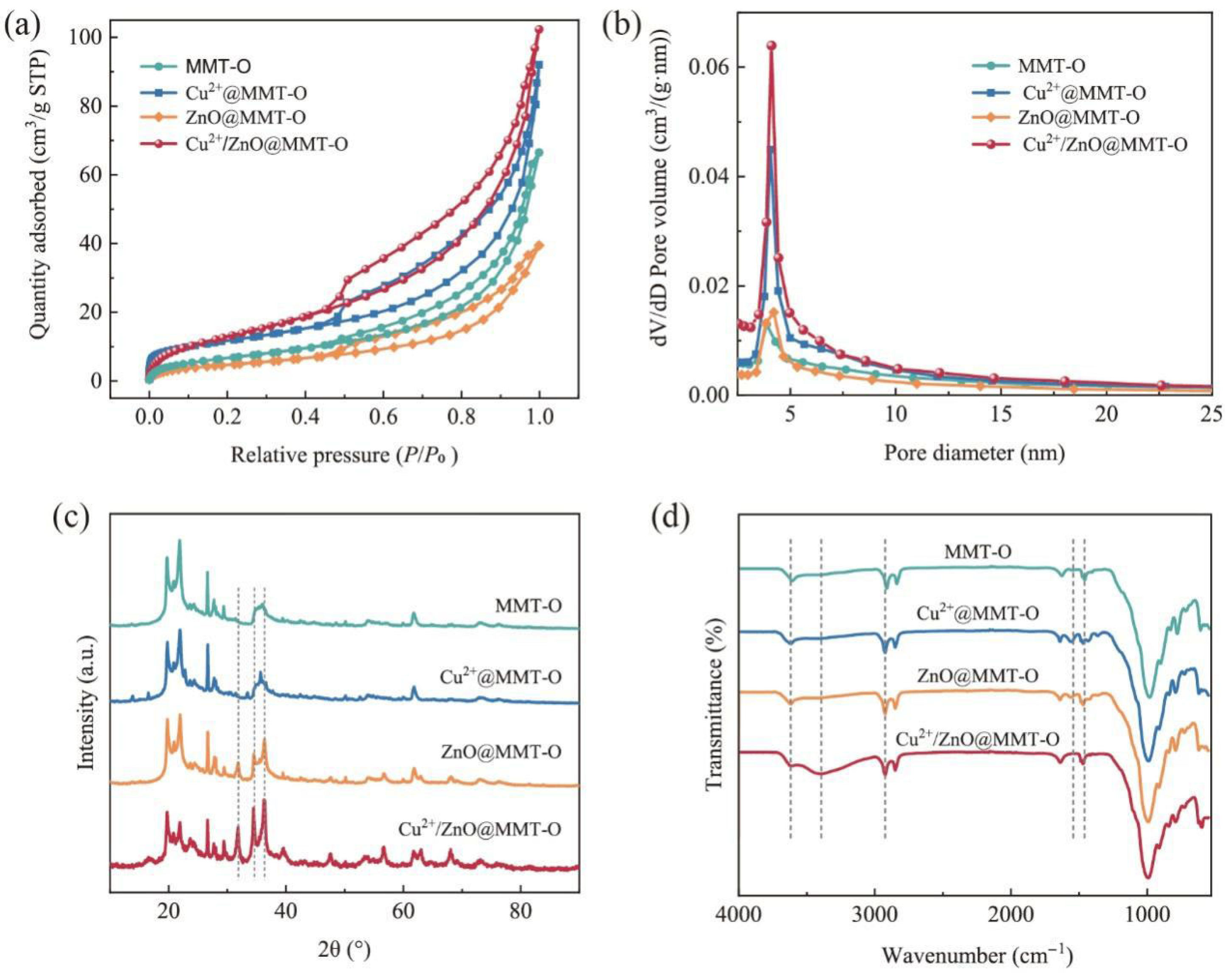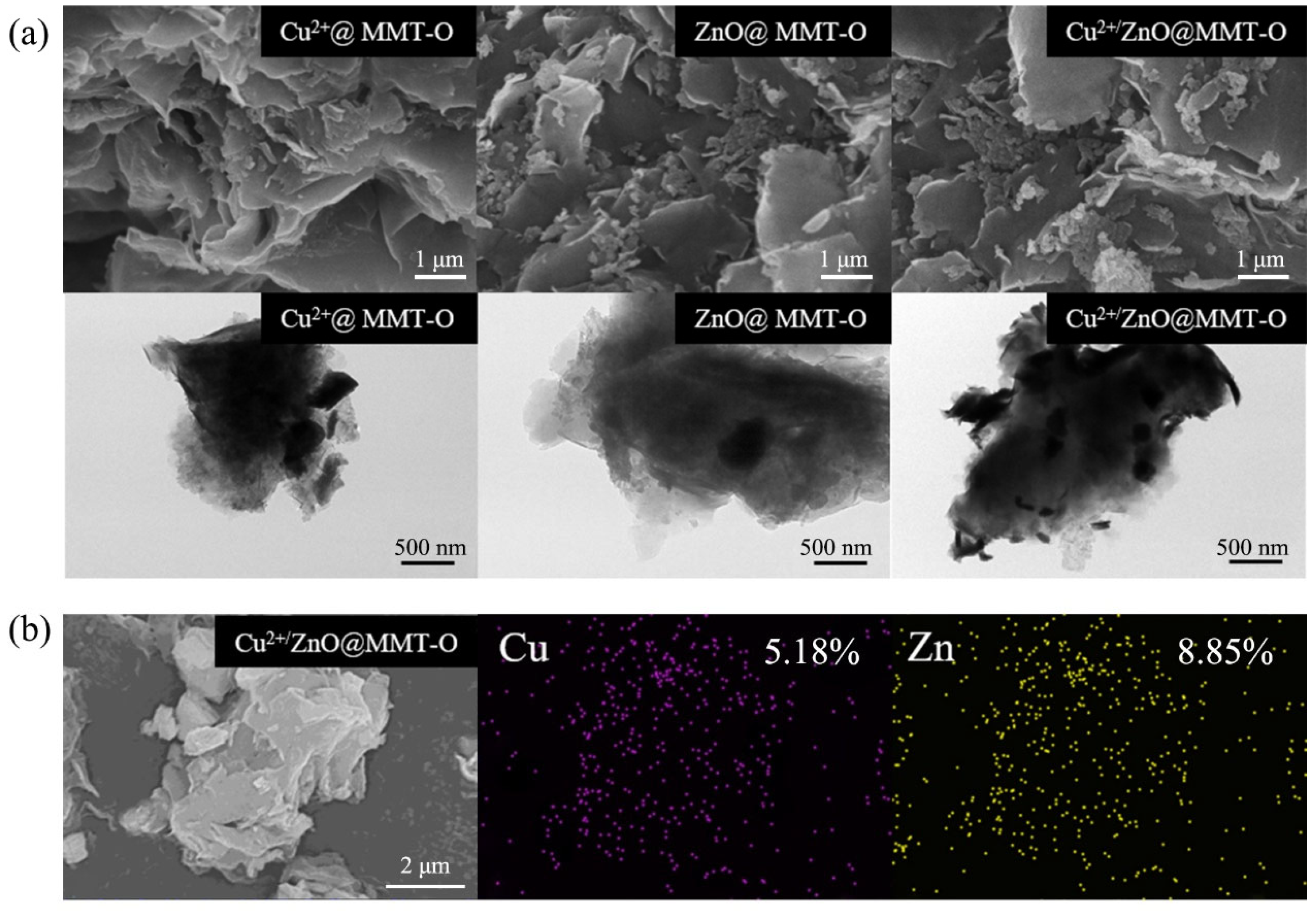 3.1. Preparation and Microstructure Characterization of Cu2+/ZnO@MMT-O Agents