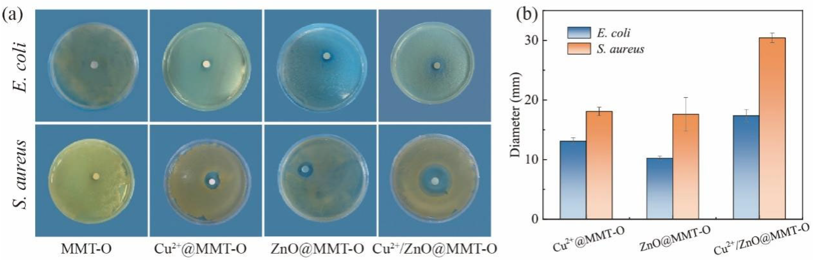 3.3. Antibacterial Performance of Cu2+/ZnO@MMT-O Agents