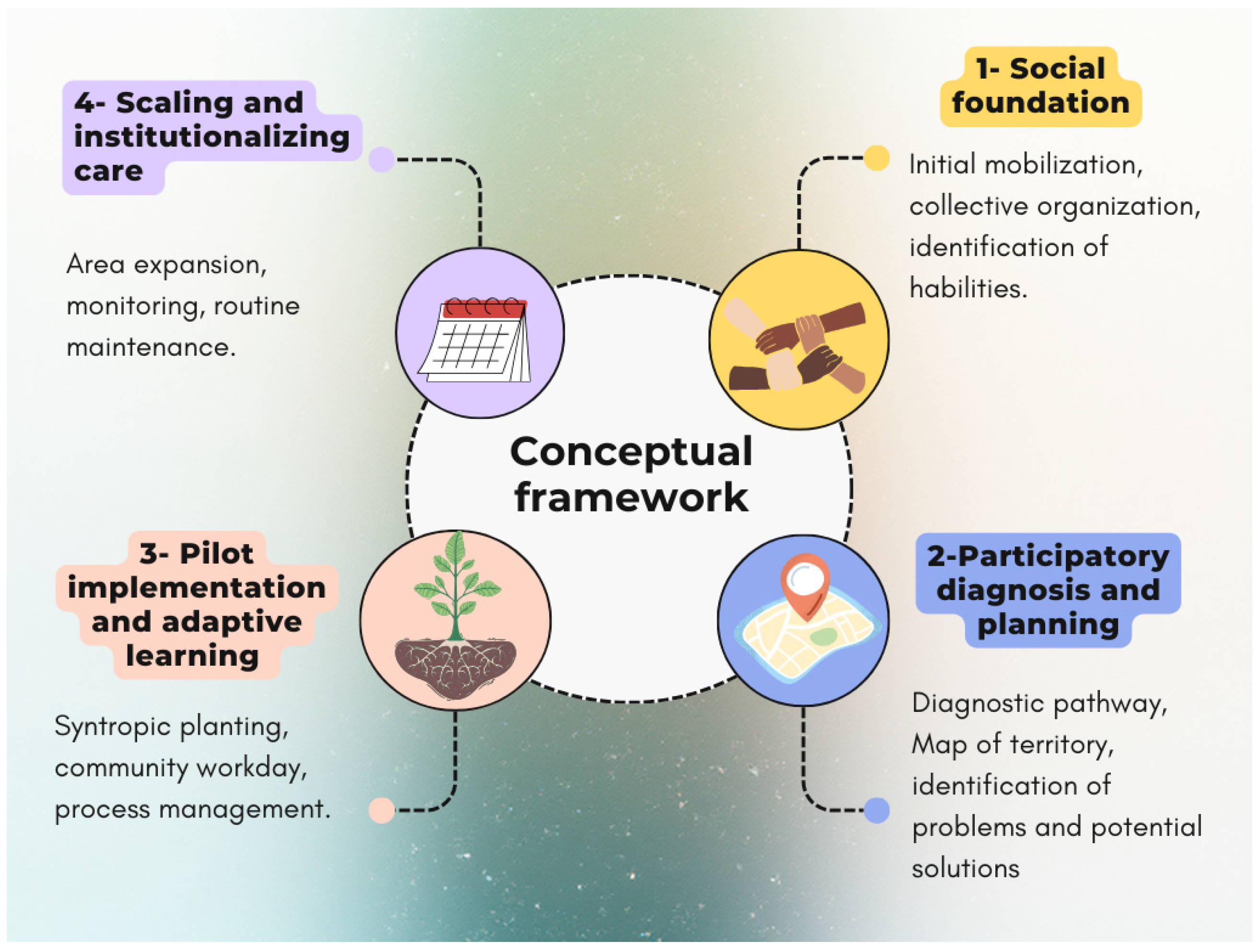 - Horizontal Governance and Role Internalization: The group organically developed a non-hierarchical functional structure. Key roles—such as technical facilitator (guiding syntropic practices), community mobilizer, institutional liaison, and documentation manager—were assumed and sustained by different members, ensuring resilience and distributing leadership.