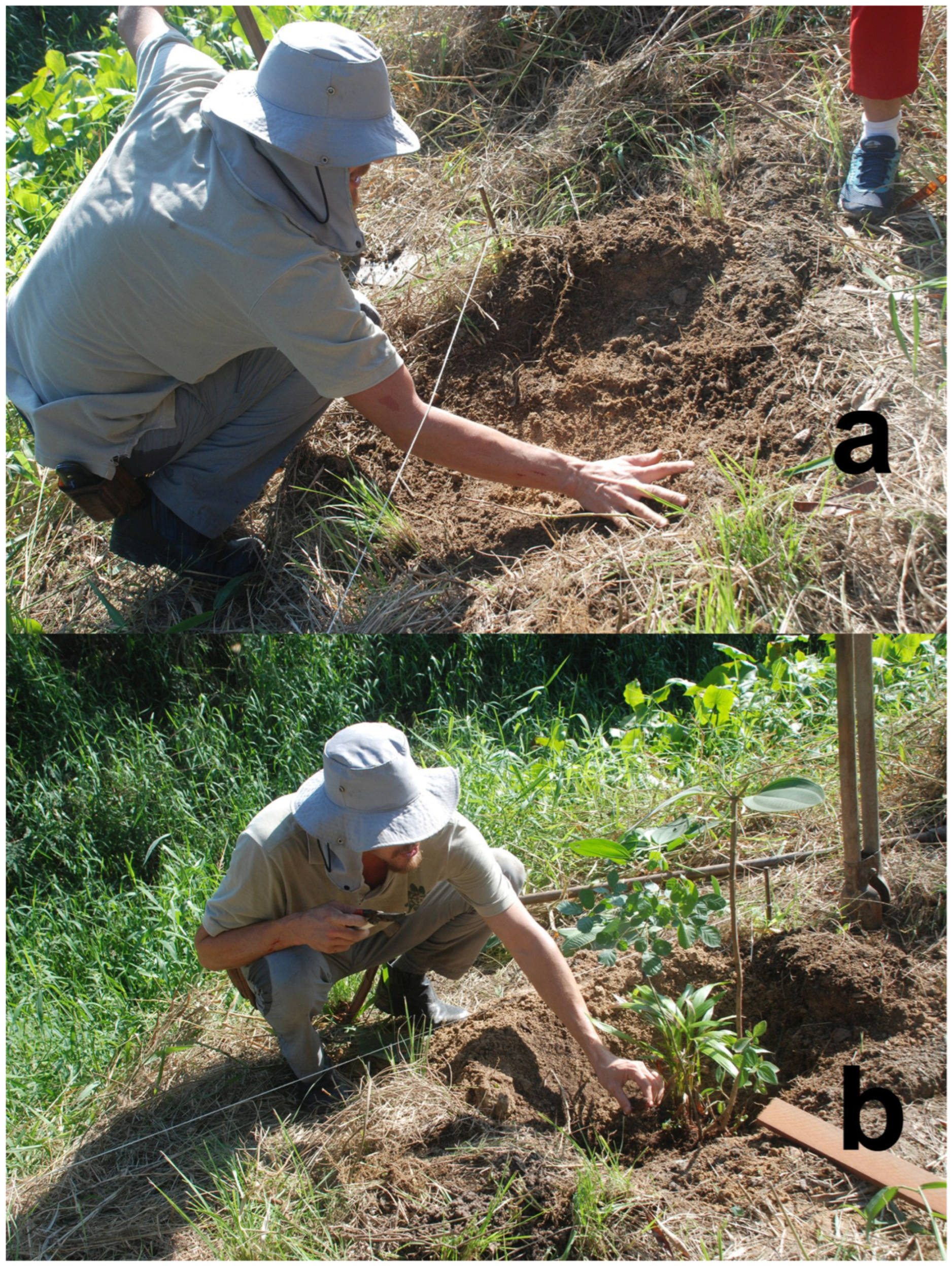 - High-Density Nesting (Figure 3): Instead of evenly spaced seedlings, planting was concentrated in densely packed nests or cradles (approx. 20–30 cm deep), spaced 1.5–3 m apart. This created immediate micro-environments conducive to plant establishment and rapid soil cover.