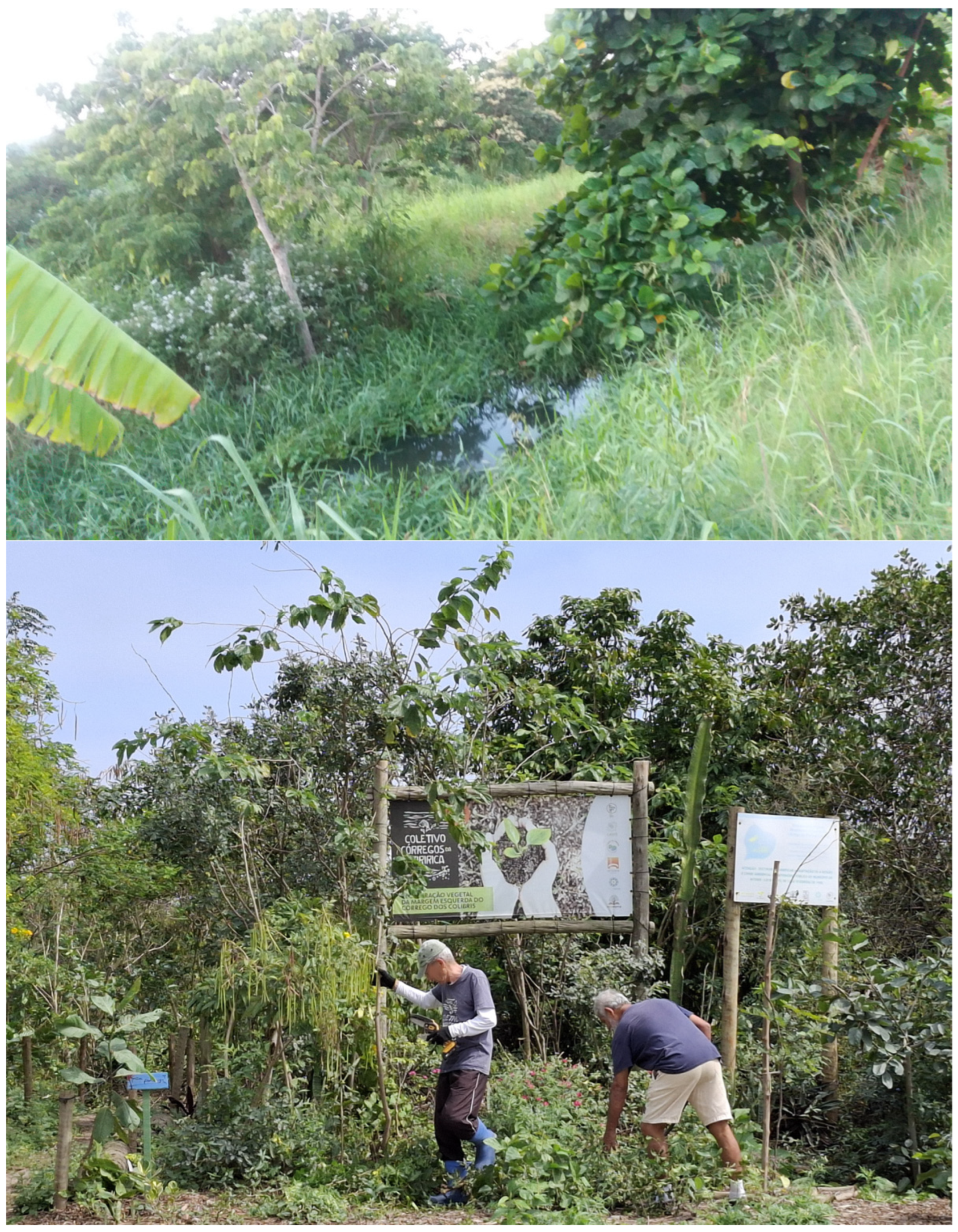 - A public and permanent photographic archive hosted on the project’s dedicated website (https://nossacasa.net/nossosriachos/tiririca/ accessed on 23 December 2025), which documents all 26 community workdays and serves as both a dissemination tool and a documentary record;