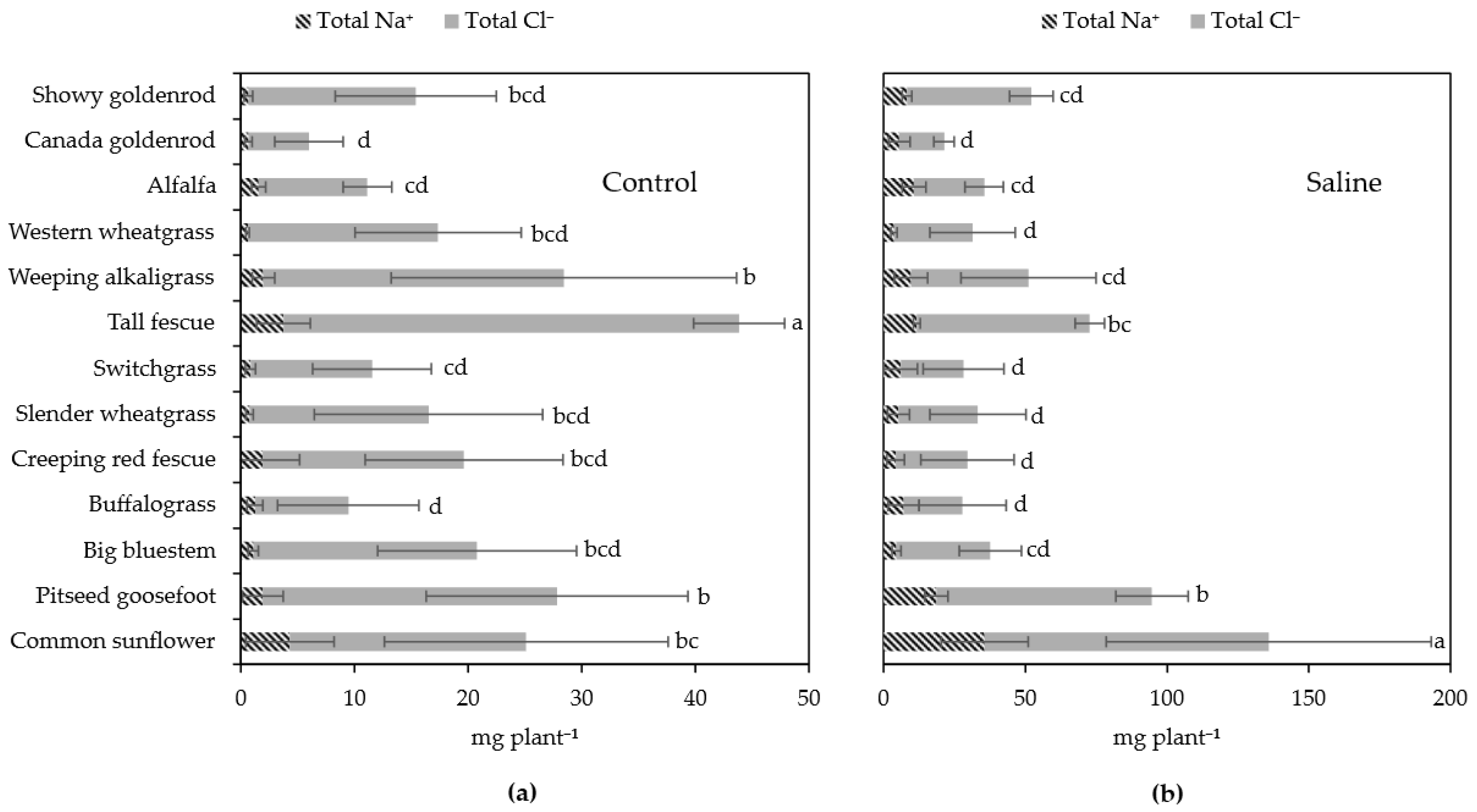 | Species | Na+ (Control) (mg g−1 DM) | Na+ (Saline) (mg g−1 DM) | Cl− (Control) (mg g−1 DM) | Cl− (Saline) (mg g−1 DM) |