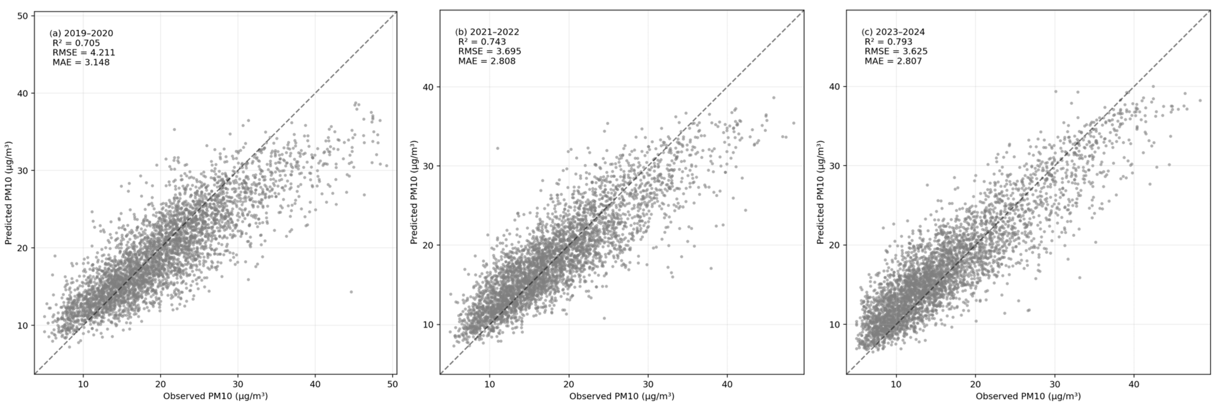 | Interval (µg/m3) | N | MAE | RMSE | Mean Residual (Pred−Obs) |