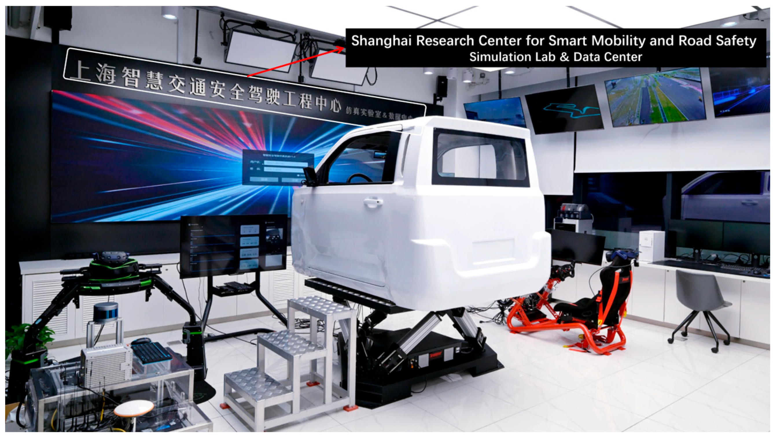 Figure 1) is equipped with a six-degrees-of-freedom motion platform, capable of realistically simulating dynamic feedback such as acceleration, deceleration, and turning sensations. The driver’s cabin is assembled according to actual vehicle standards and is fitted with hardware including a steering wheel, pedals, and gear shifter. A front panoramic screen and in-car displays replicate a complete driving field of view and rearview mirror information. An integrated audio system is employed to simulate vehicle and environmental sounds.