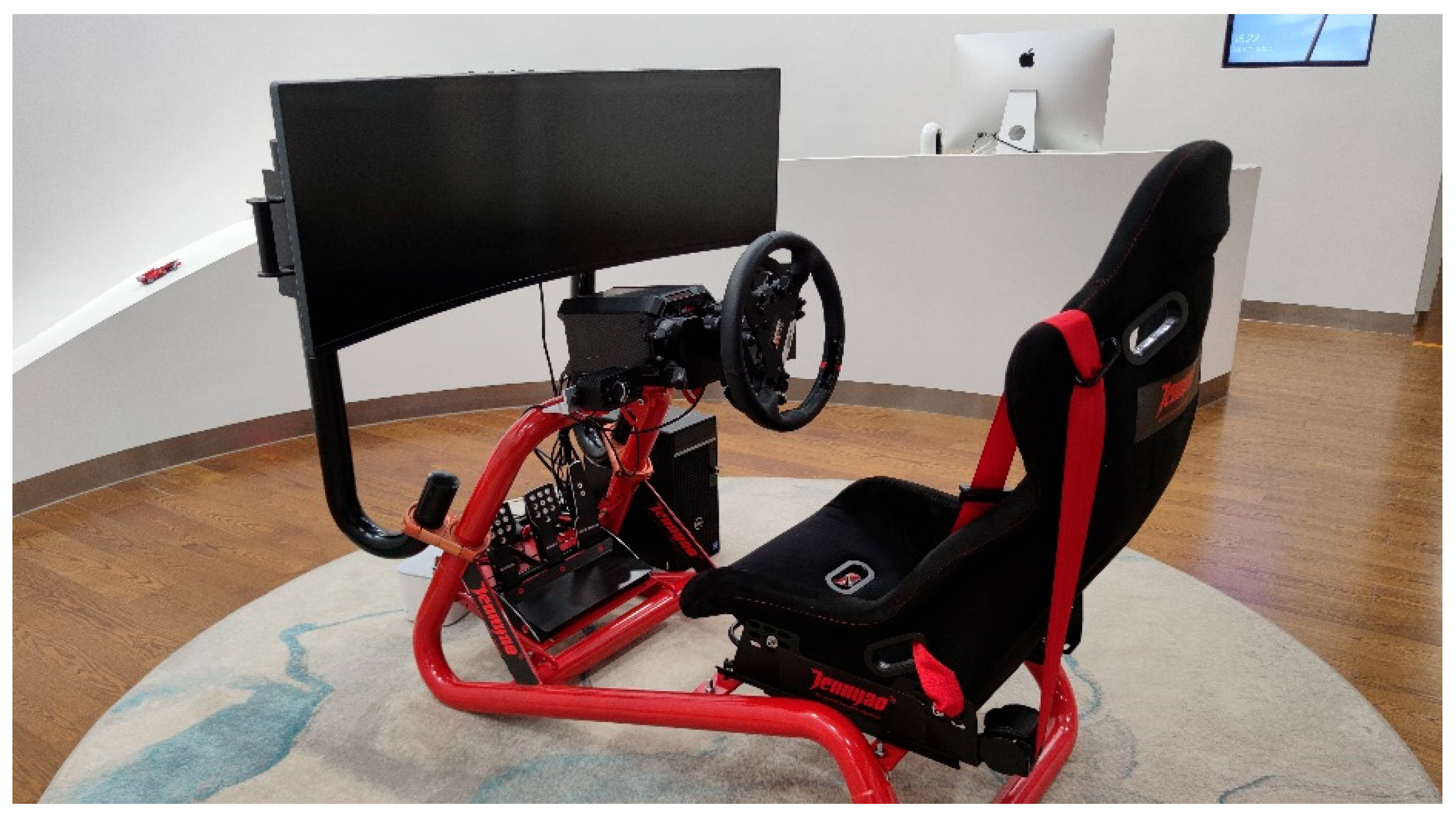 Figure 2) features a curved front display screen, and is equipped with a full set of operating hardware, including a steering wheel, turn signal stalk, gear shifter, and pedals. It supports the connection of headphones or external speakers to provide auditory feedback.