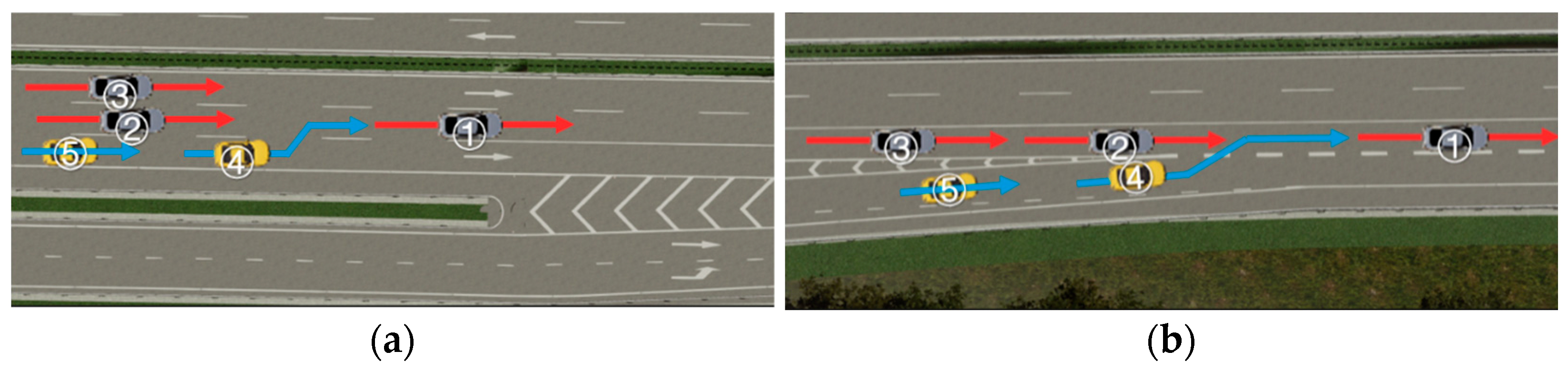 Scene 1 (Mainline Merging): This scene simulated a scenario where vehicles were in the mainline area before entering an upcoming acceleration lane. Specifically, vehicles in the rightmost mainline lane (Vehicle ④ and Vehicle ⑤) need to change lanes to the left in advance to avoid the extended solid line area ahead, thereby interacting with the traffic stream in the adjacent left lane (Vehicle ①, Vehicle ②, and Vehicle ③).