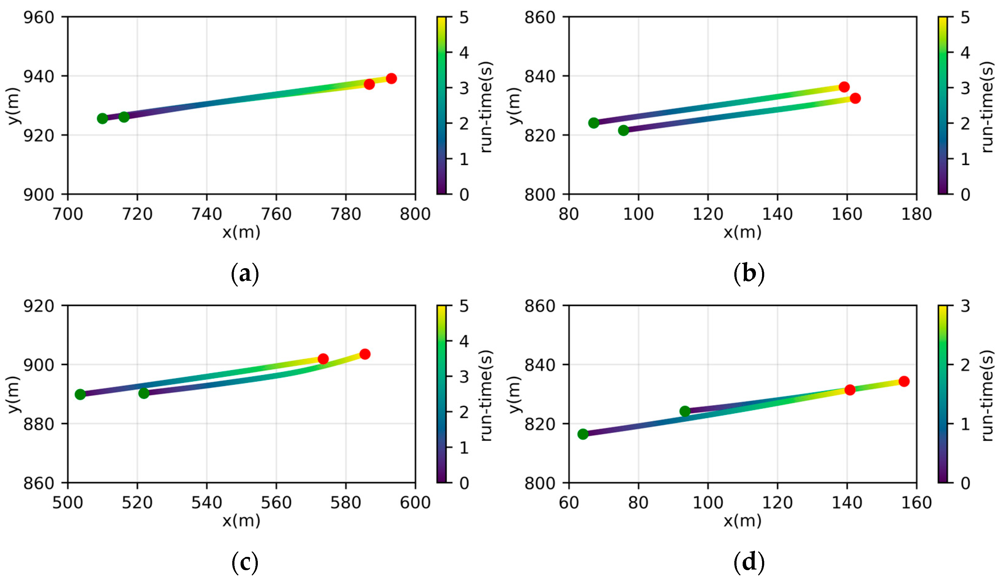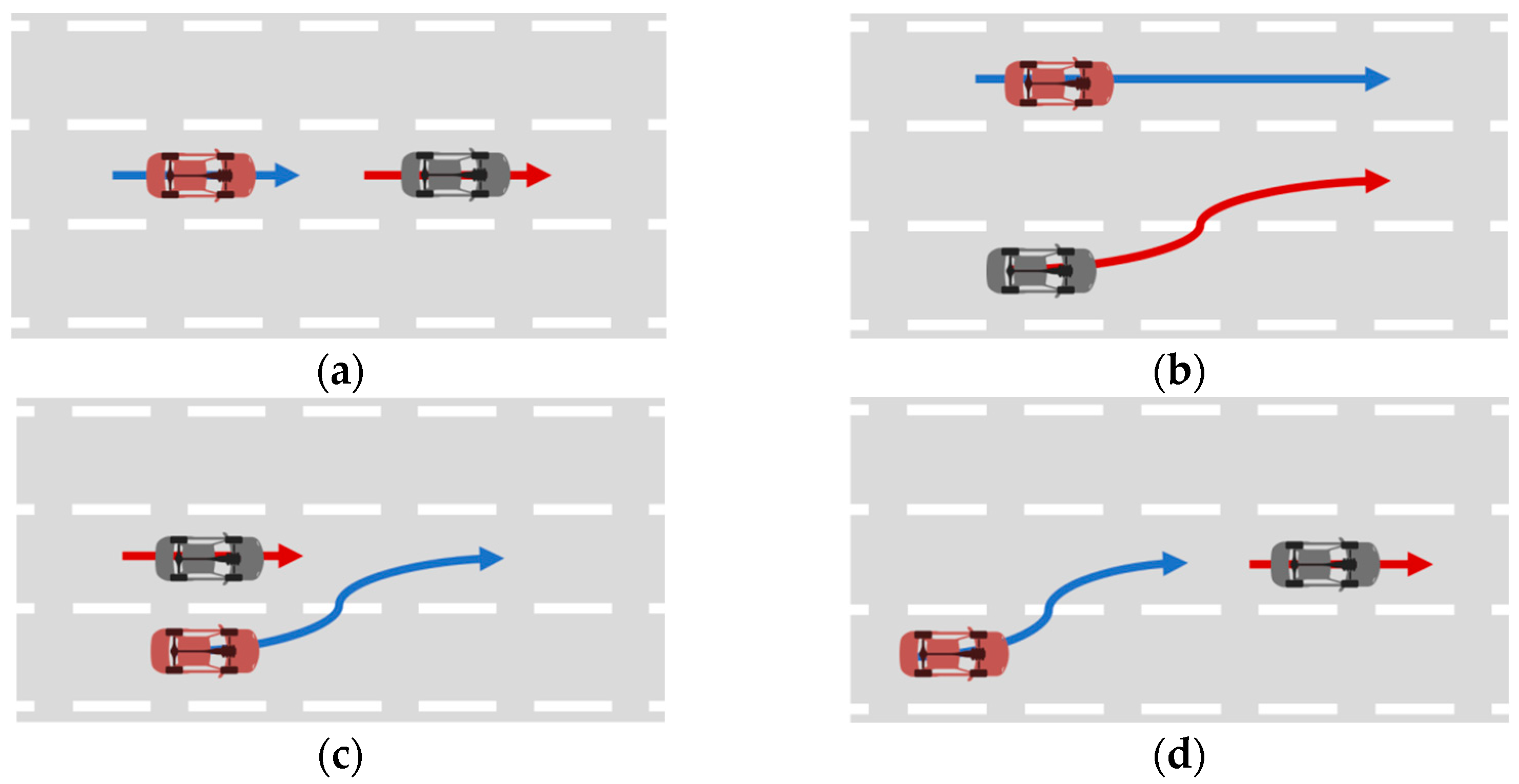 Trajectory diagrams of the four vehicle Interaction Behavior Patterns: (a) Longitudinal Effect; (b) Lateral Effect; (c) Front Insertion; (d) Rear Insertion.