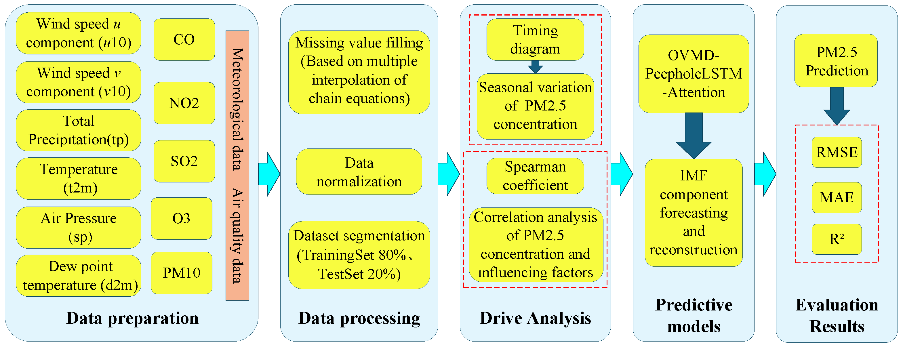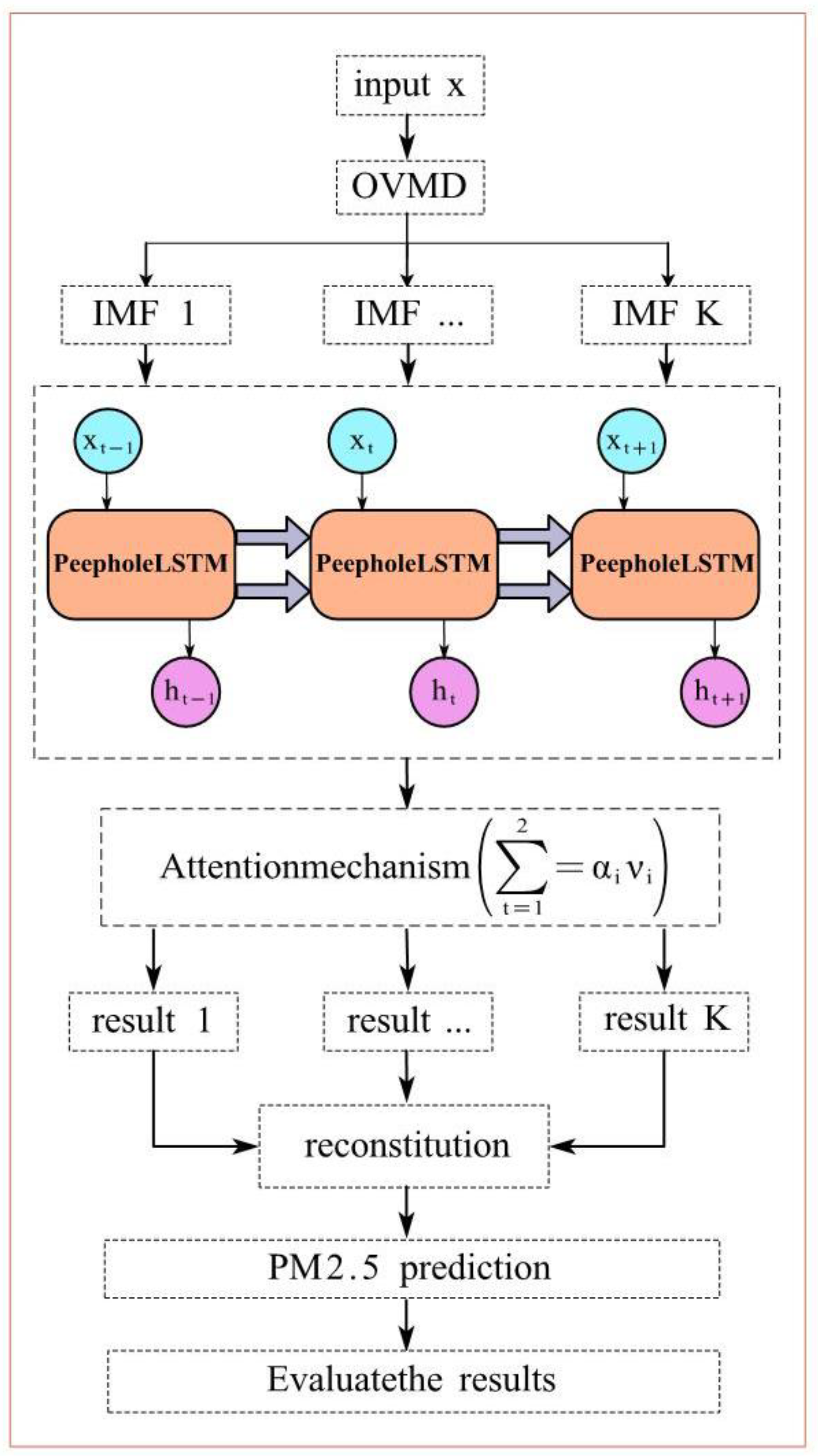 concentration changes. Subsequently, the preprocessed dataset is divided and normalized. Employing the ‘decomposition–prediction–reconstruction’ modeling approach, this is input into the OVMD–PeepholeLSTM–attention model (hereafter referred to as PeepholeLSTM-OA) to obtain the final