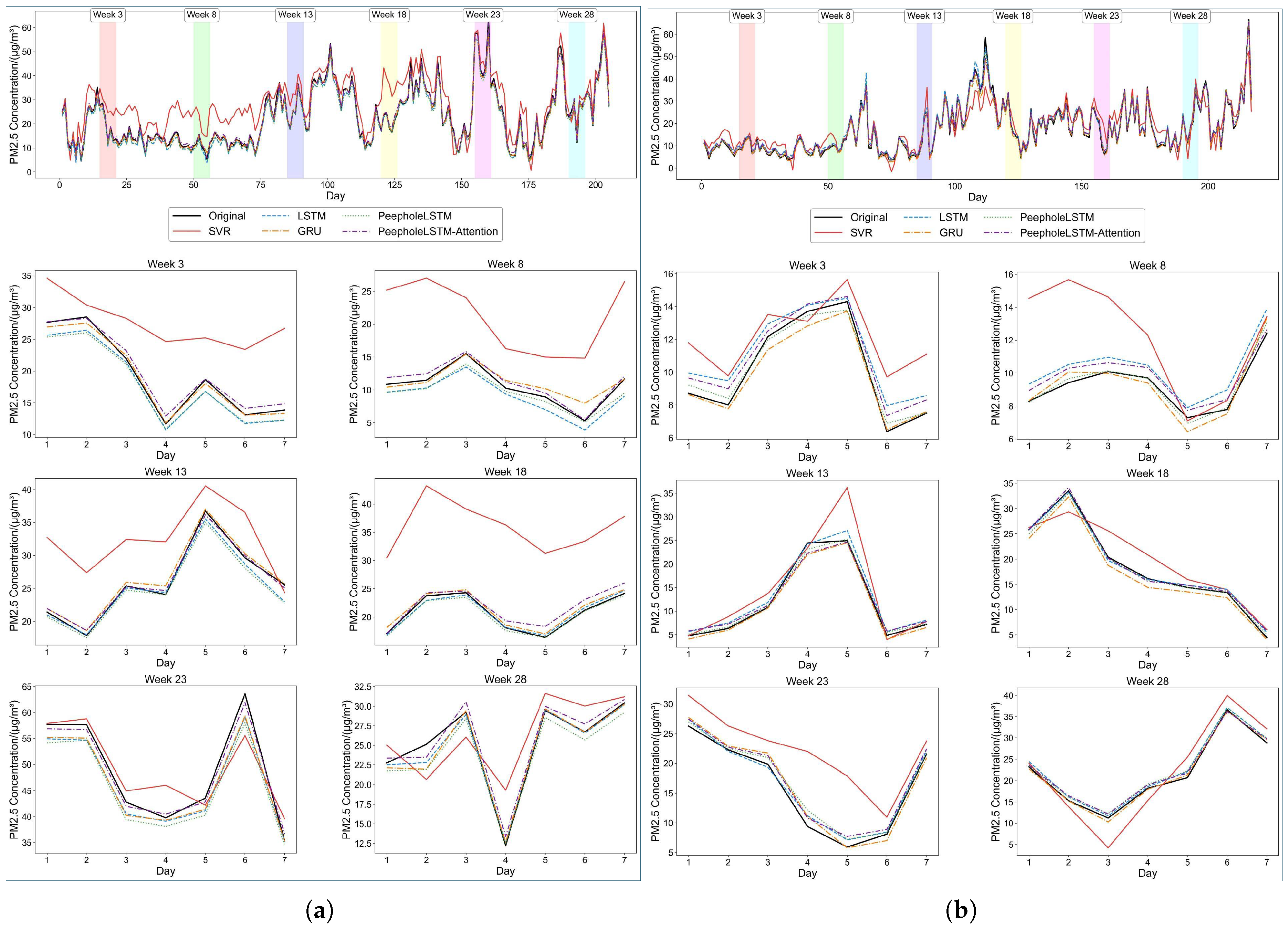 Data from the Guangzhou and Shenzhen stations were separately input into the SVR, LSTM, GRU, PeepholeLSTM, and PeepholeLSTM–attention models for training and