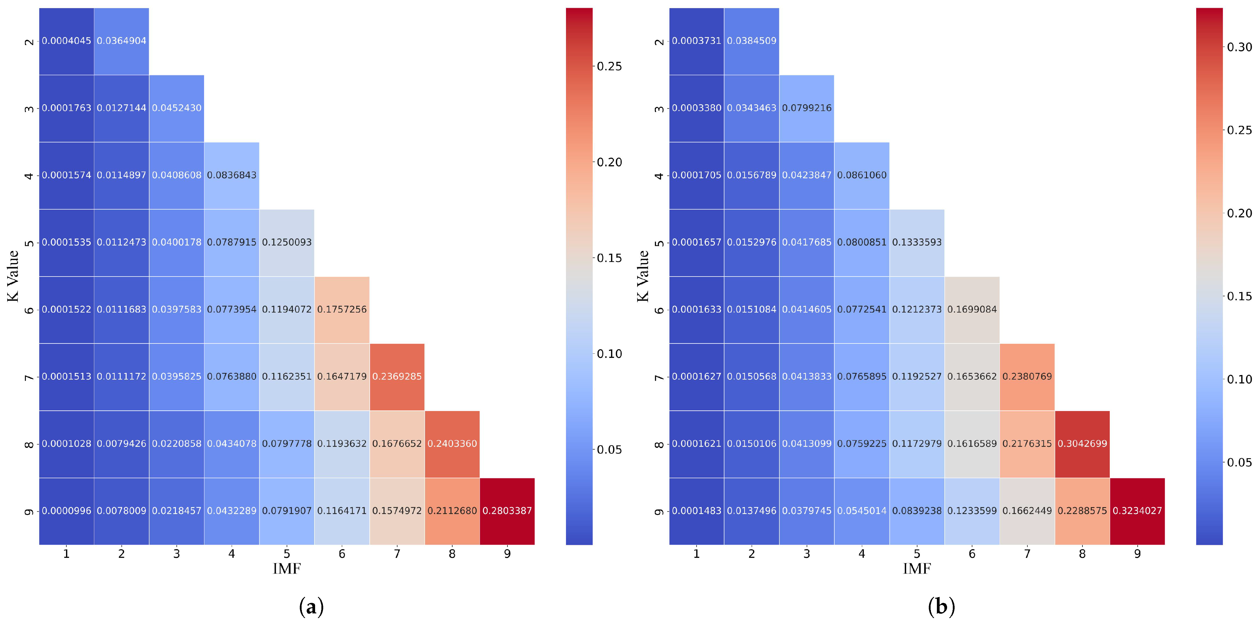 Through continuous iterative updates of modal components and central frequencies, it decomposes the original data into K intrinsic mode functions (IMFs) with distinct frequency characteristics. The efficacy of VMD and the subsequent predictive accuracy of the model are largely influenced by the choice of K. An insufficient number of decomposed modes will lead to insufficient decomposition and ineffective identification of data patterns. Conversely, an excessive modal decomposition can result in mode mixing between adjacent components. Therefore, in this study, the Optimal Variational Mode Decomposition (OVMD) algorithm was employed to decompose the monitoring data.