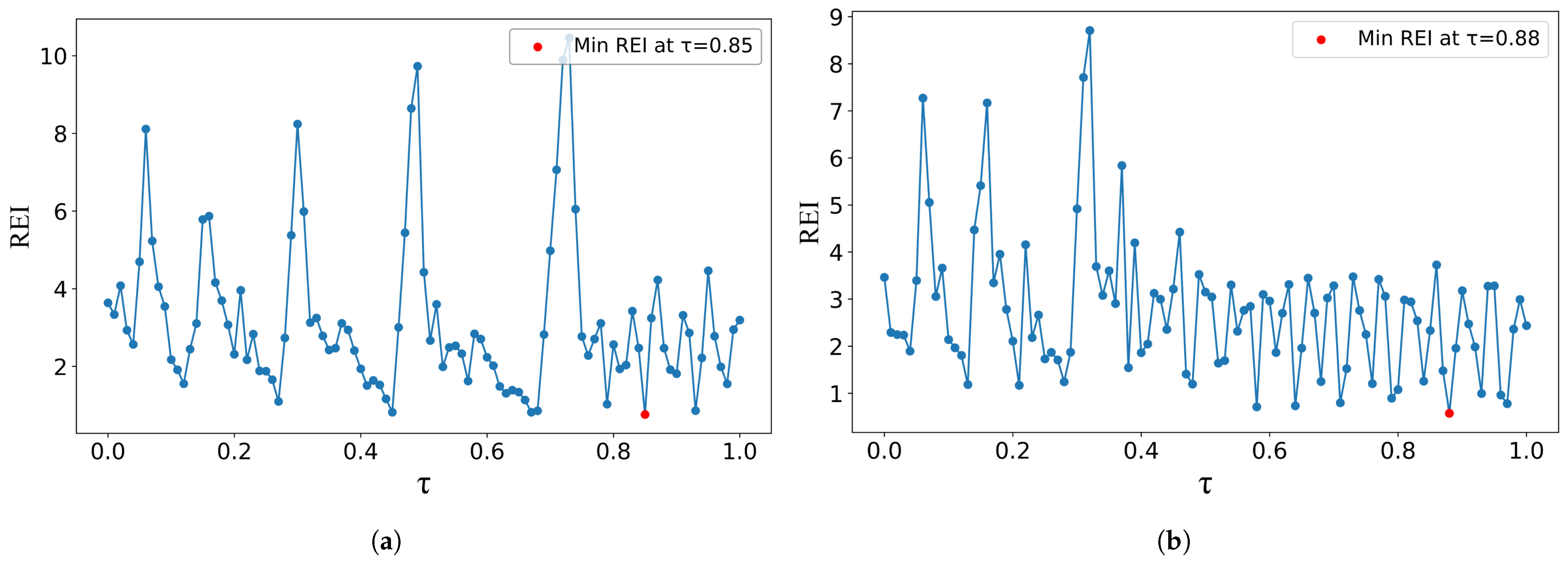 Unlike VMD, which requires empirical setting of hyperparameters, the OVMD algorithm determines the optimal value of K by analyzing the distribution of the center frequencies of the IMF components. In this way, the decomposition avoids both insufficient separation and mode mixing. The update step size is a core hyperparameter used in the OVMD decomposition process to control the convergence speed of signal decomposition iterations and to balance decomposition accuracy and computational efficiency. Its value directly affects the Residual Evaluation Index (REI), which in turn determines the rationality of the OVMD decomposition results: if is too large, it can lead to insufficient decomposition and larger residuals, while if it is too small, it increases the computational load and may cause over-decomposition. After the optimal K is obtained, the OVMD method reconstructs the IMF components generated under different step sizes and calculates their Relative Entropy Index (REI). The step size that yields the minimum REI value is selected as the optimal parameter, with the range of step size as [0, 1].