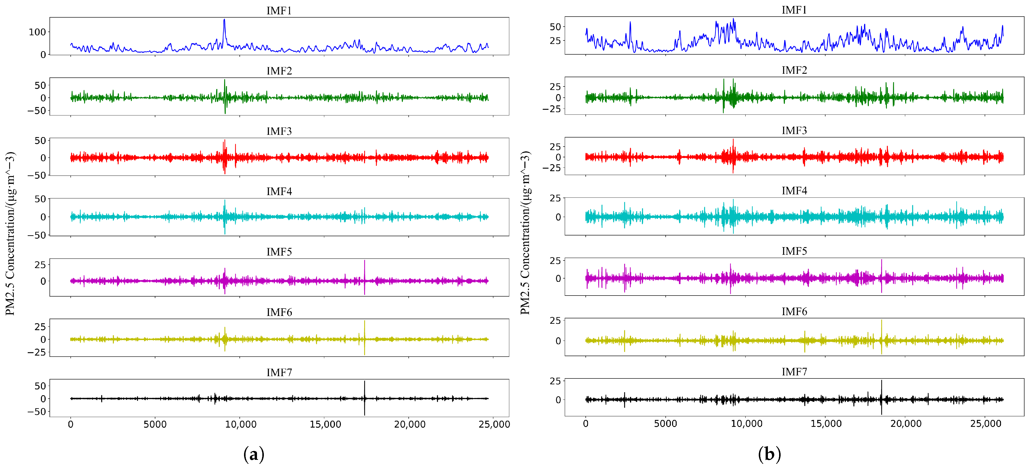 Figure 10. As can be seen from the figure, whether at Guangzhou Station or Shenzhen Station, the waveform fluctuations of the IMF1 component are the most dense and significantly higher than those of the subsequent components, which is a typical high-frequency fluctuation characteristic. This component has the fastest amplitude changes and the highest frequency, reflecting the short-term, rapid random fluctuations and high-frequency variations caused by sudden pollution events in the