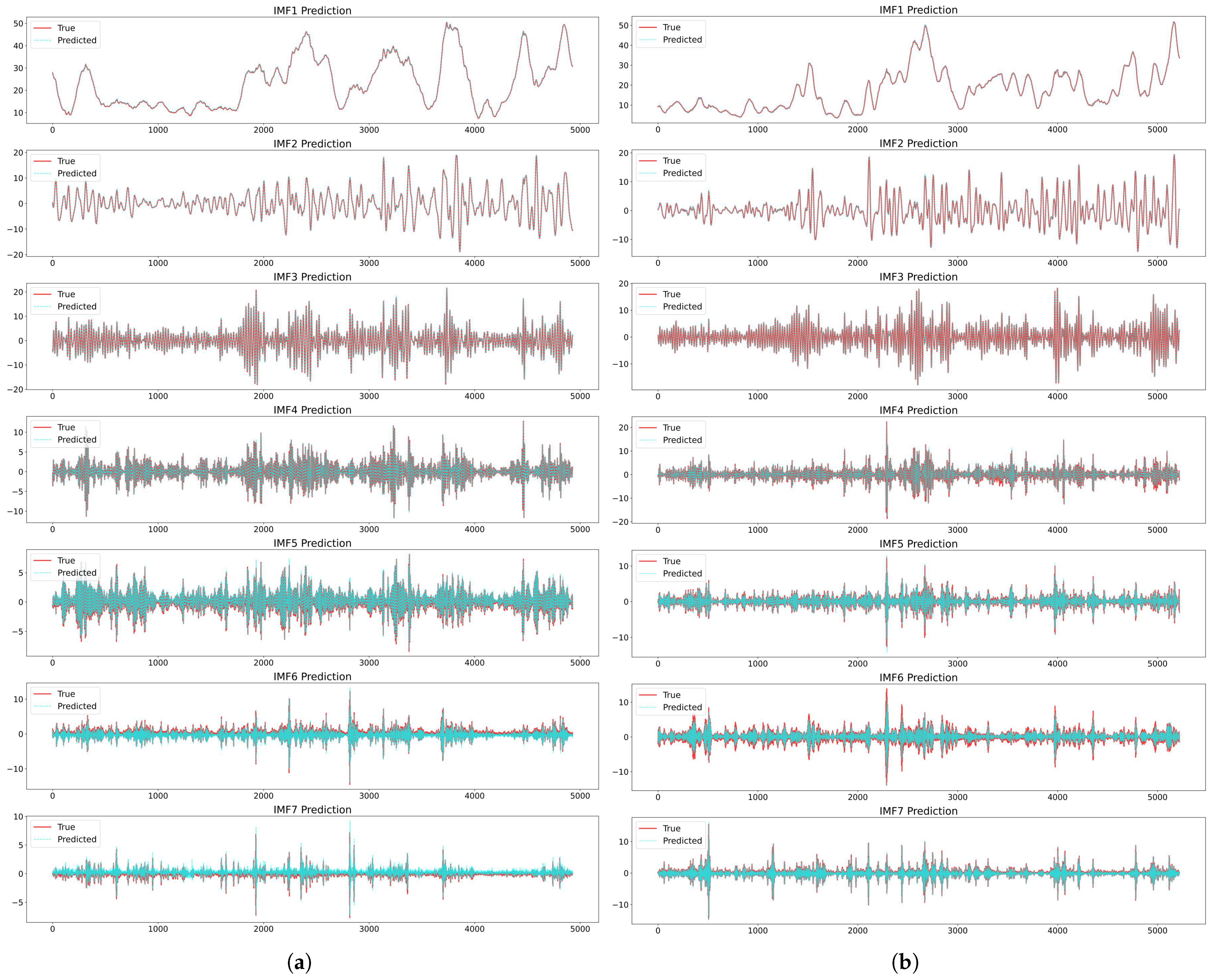 Figure 11. The results indicate that the model has fully grasped the characteristic patterns of each IMF component (including the long-term stable trend of low-frequency components and the short-term fluctuation features of high-frequency components), and is able to accurately capture the variation details of each component. This enables precise prediction of the actual change trend and peak positions of