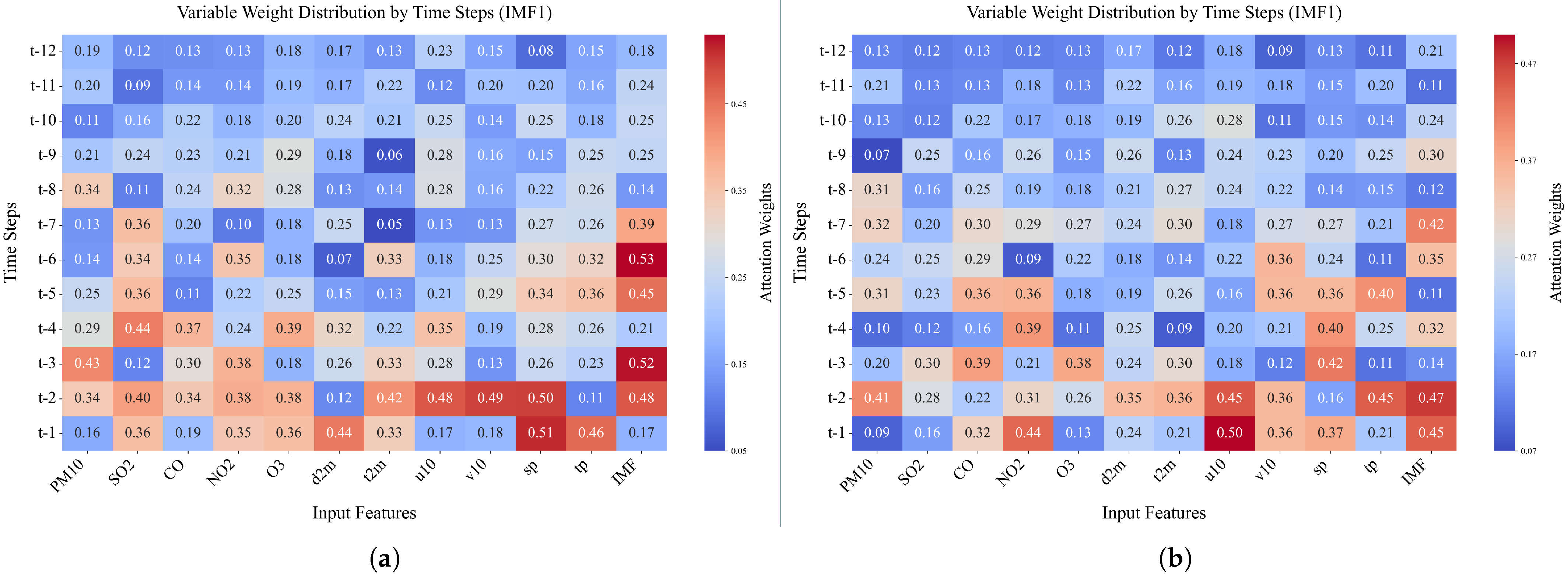 Figure 12). Analysis shows that the model demonstrates significantly differentiated attention characteristics for input time step features of different modal components; notably, the IMF components have the highest weights compared to the other 11 features, and this attention pattern aligns closely with the physical significance of each IMF component. For pollutants like