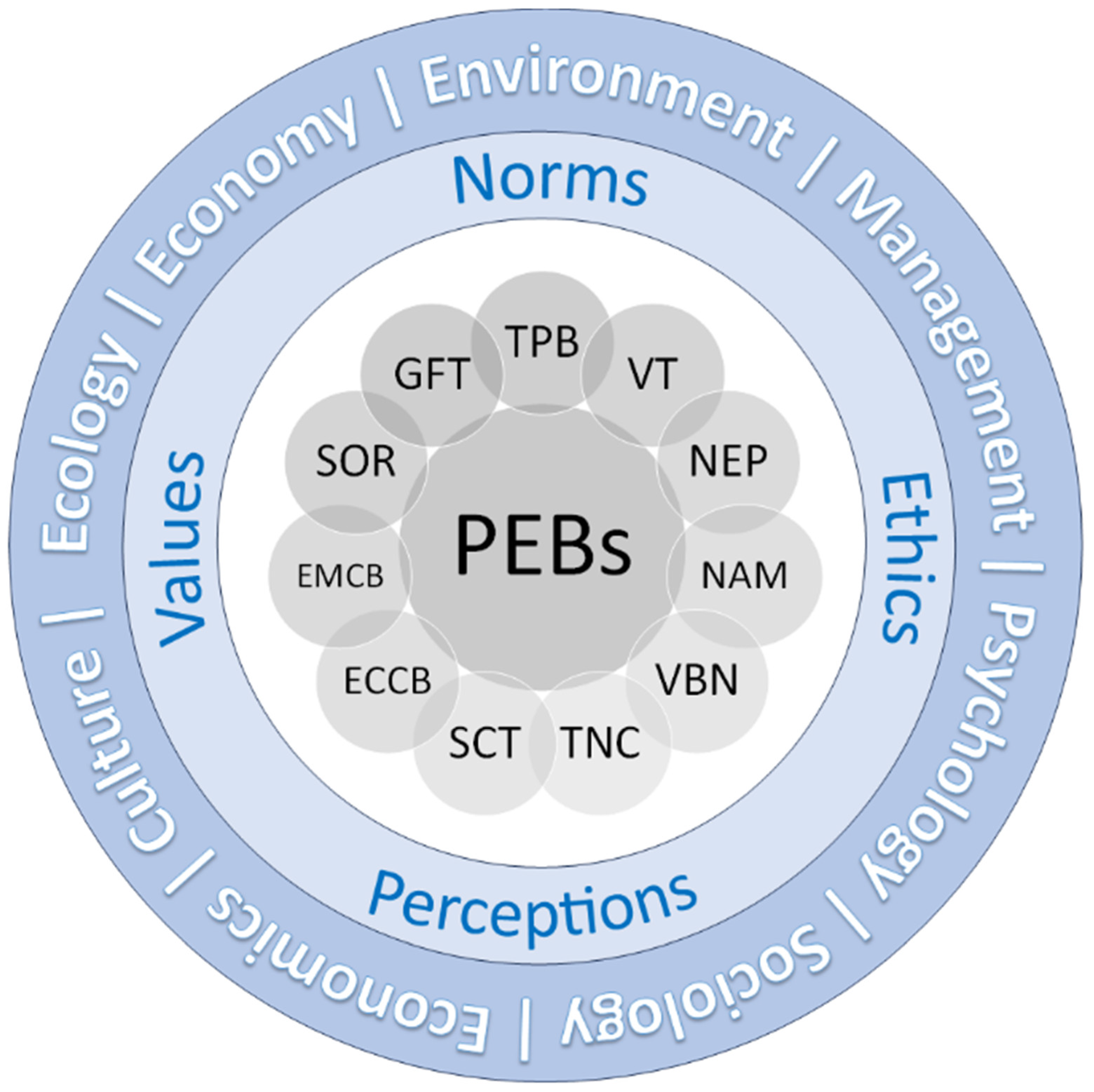 | Value Theory (VT) | The “value theory” shows that the PEB is highly linked to individuals who focus on more intellectual aspects (e.g., altruism, pro-social behaviour, and nature-related values as biospheric values). | [62,63] |