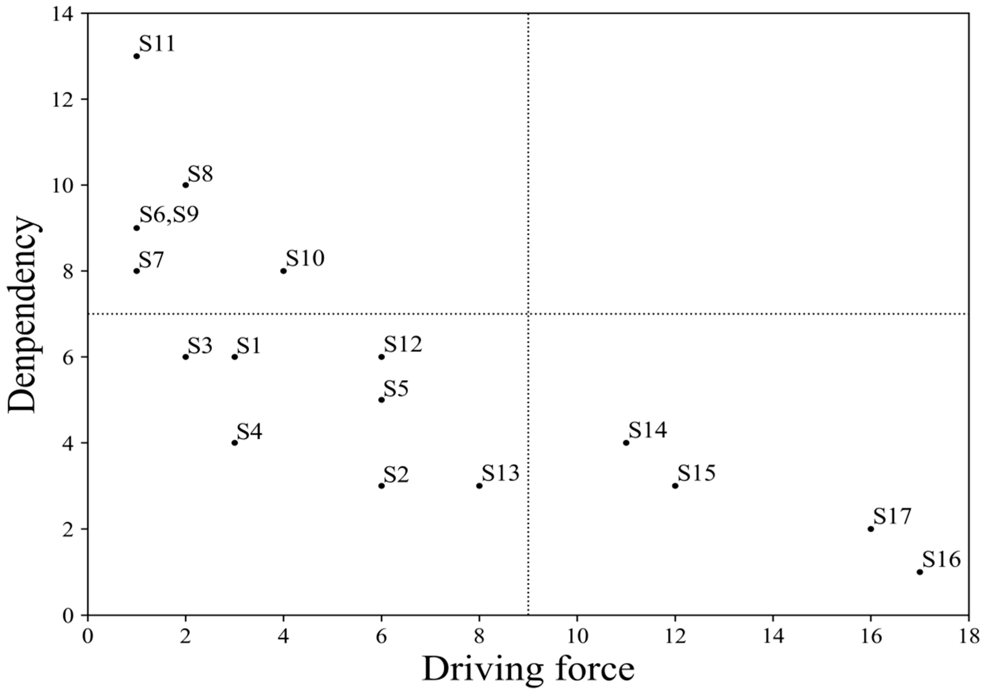 3.4. Construction of a Fuzzy DEMATEL-ISM-MICMAC Integrated Model