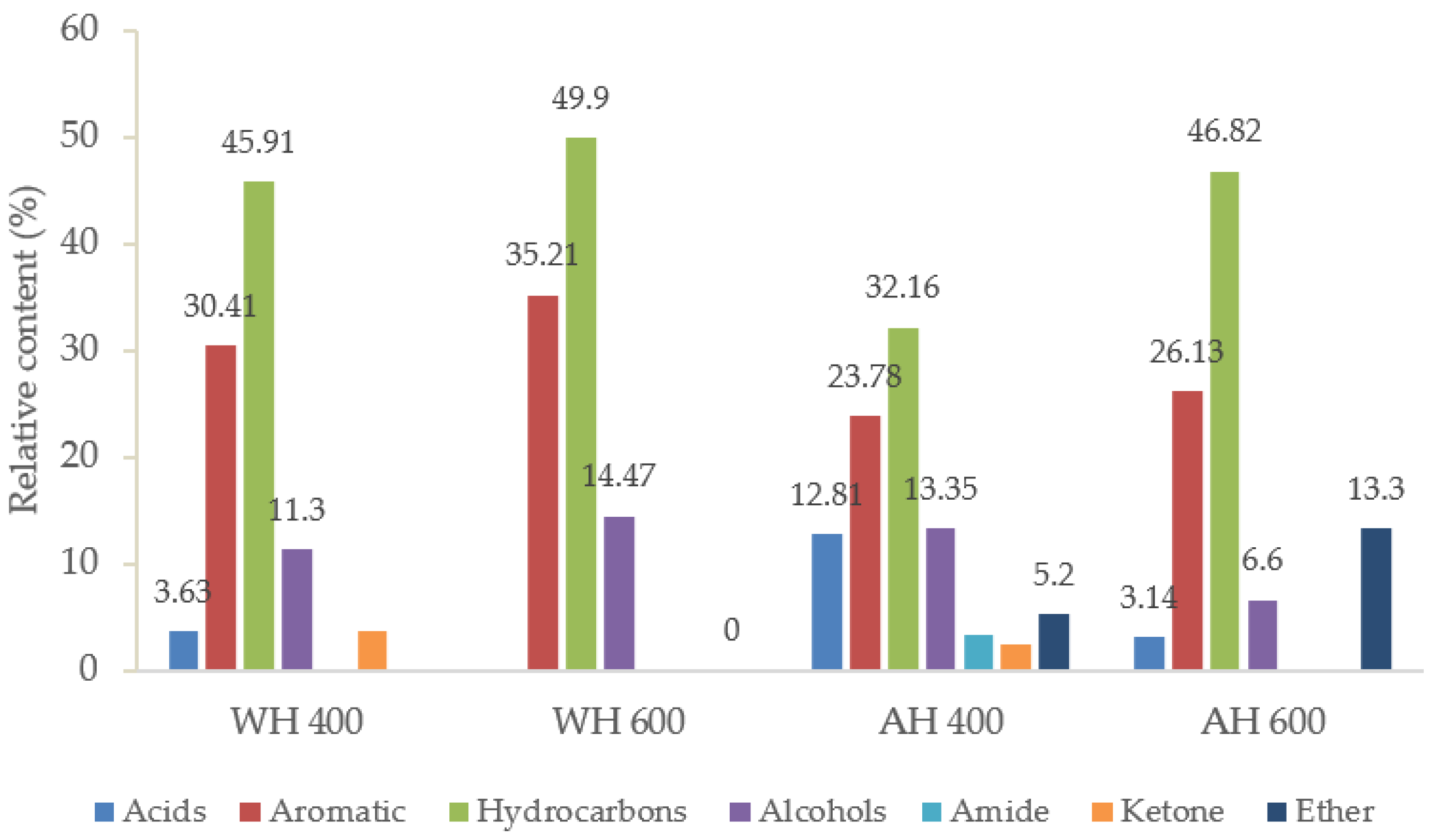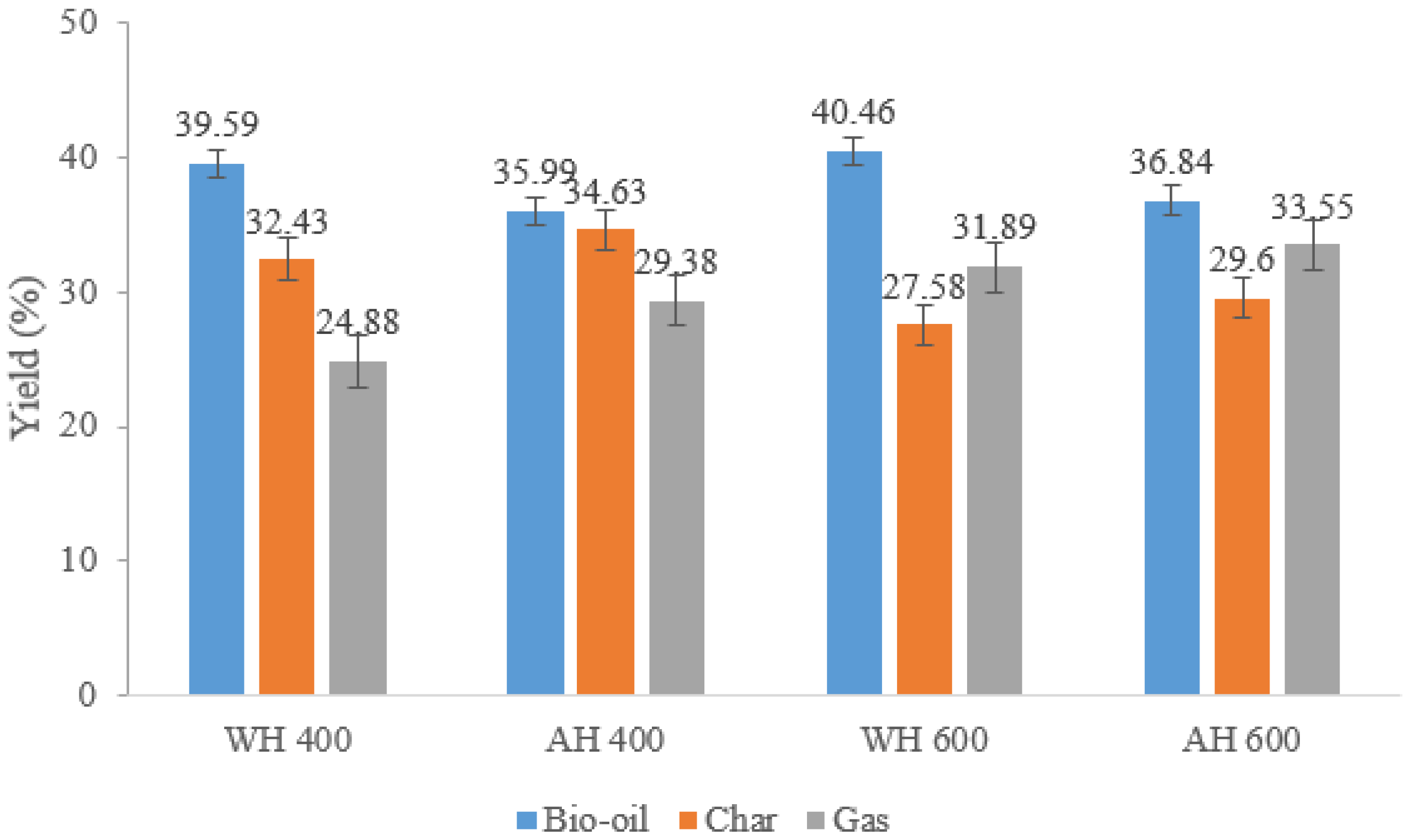 3.2. Effect of Pyrolysis Temperature on Product Yields