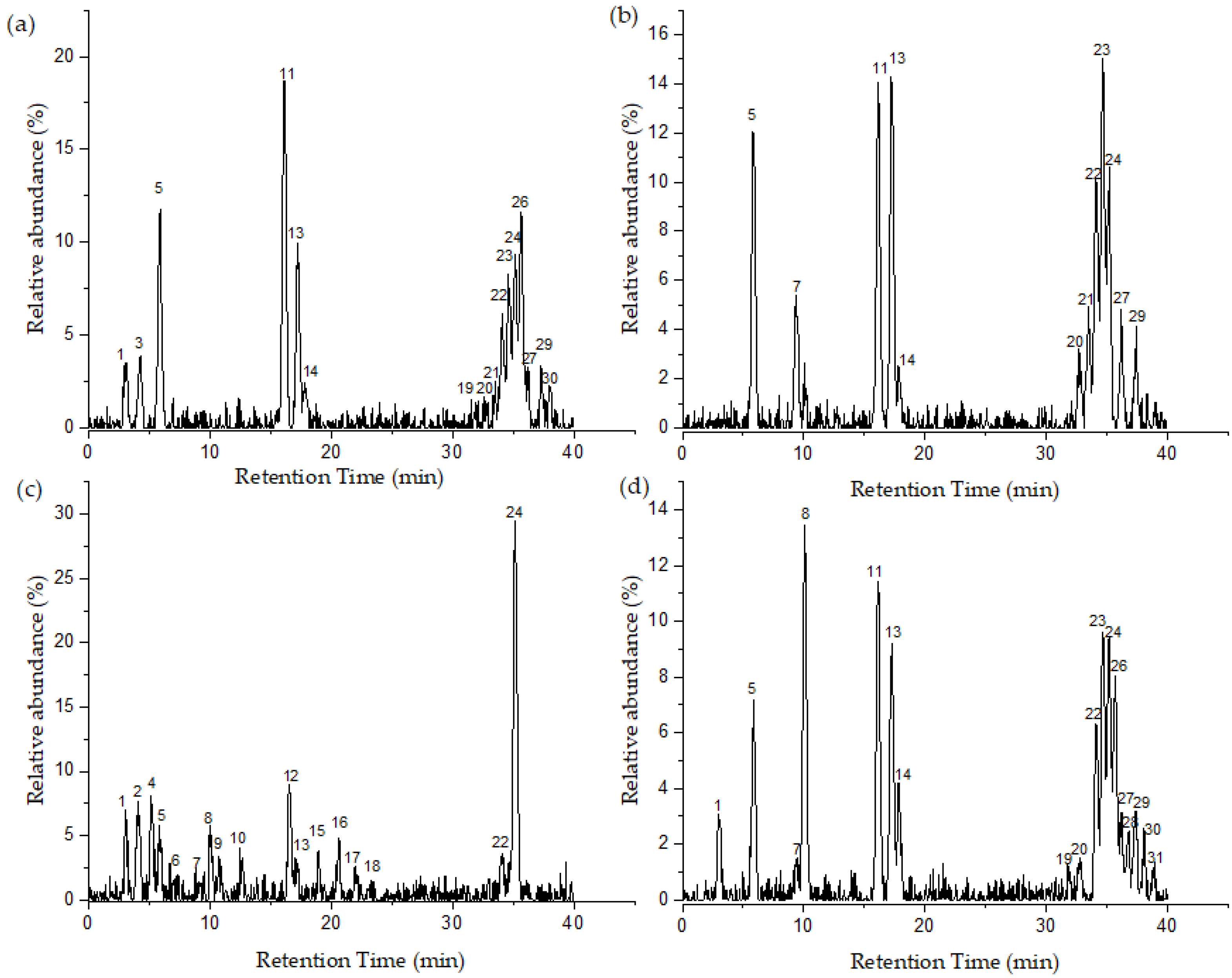| N° | Compounds | Formula | tR (min) | Relative Content (%) | |||