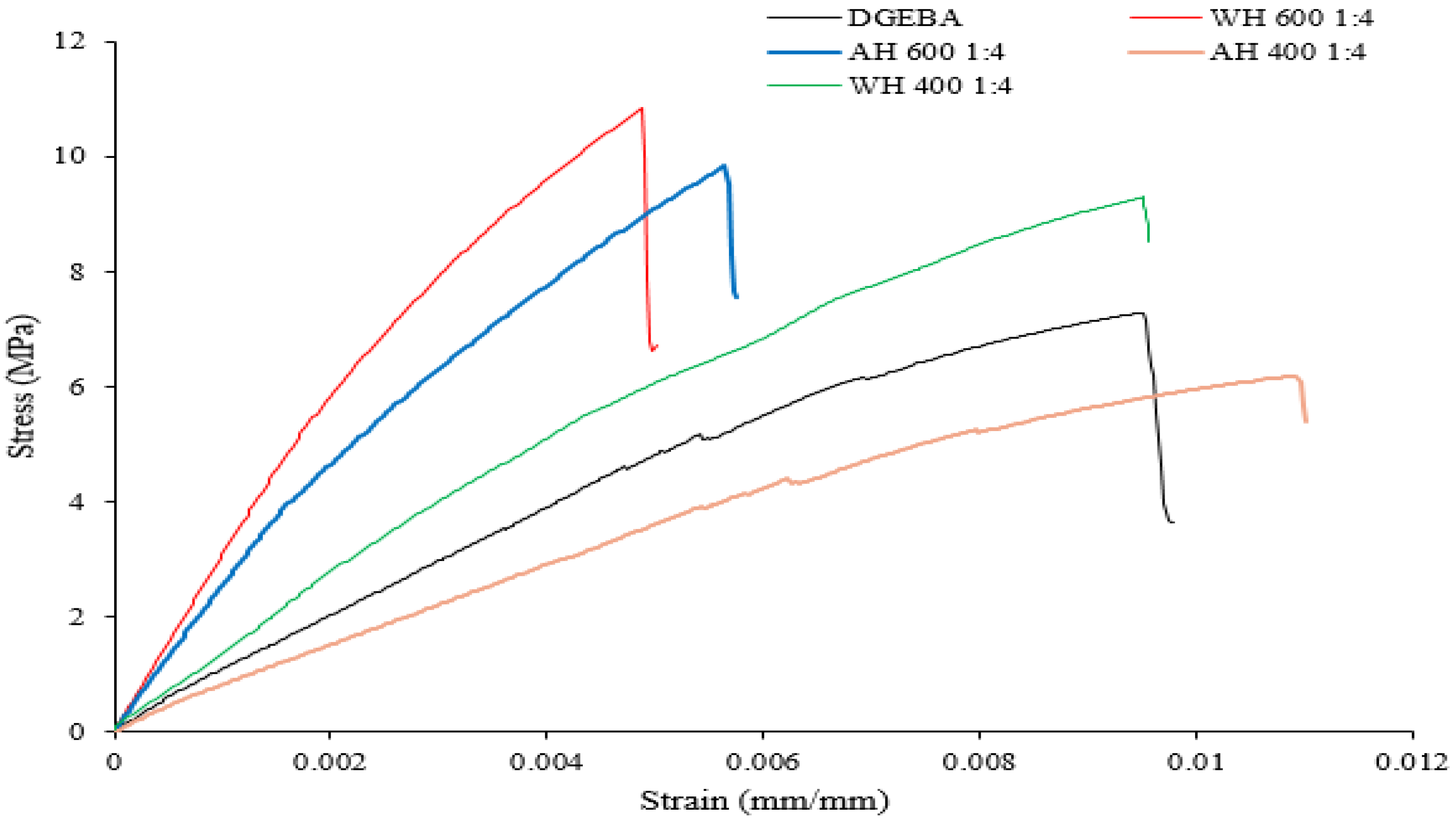 | WH 600 1:4 | 1:4 | Bio-oil from walnut hulls pyrolyzed at 600 °C, mixed with DGEBA |
