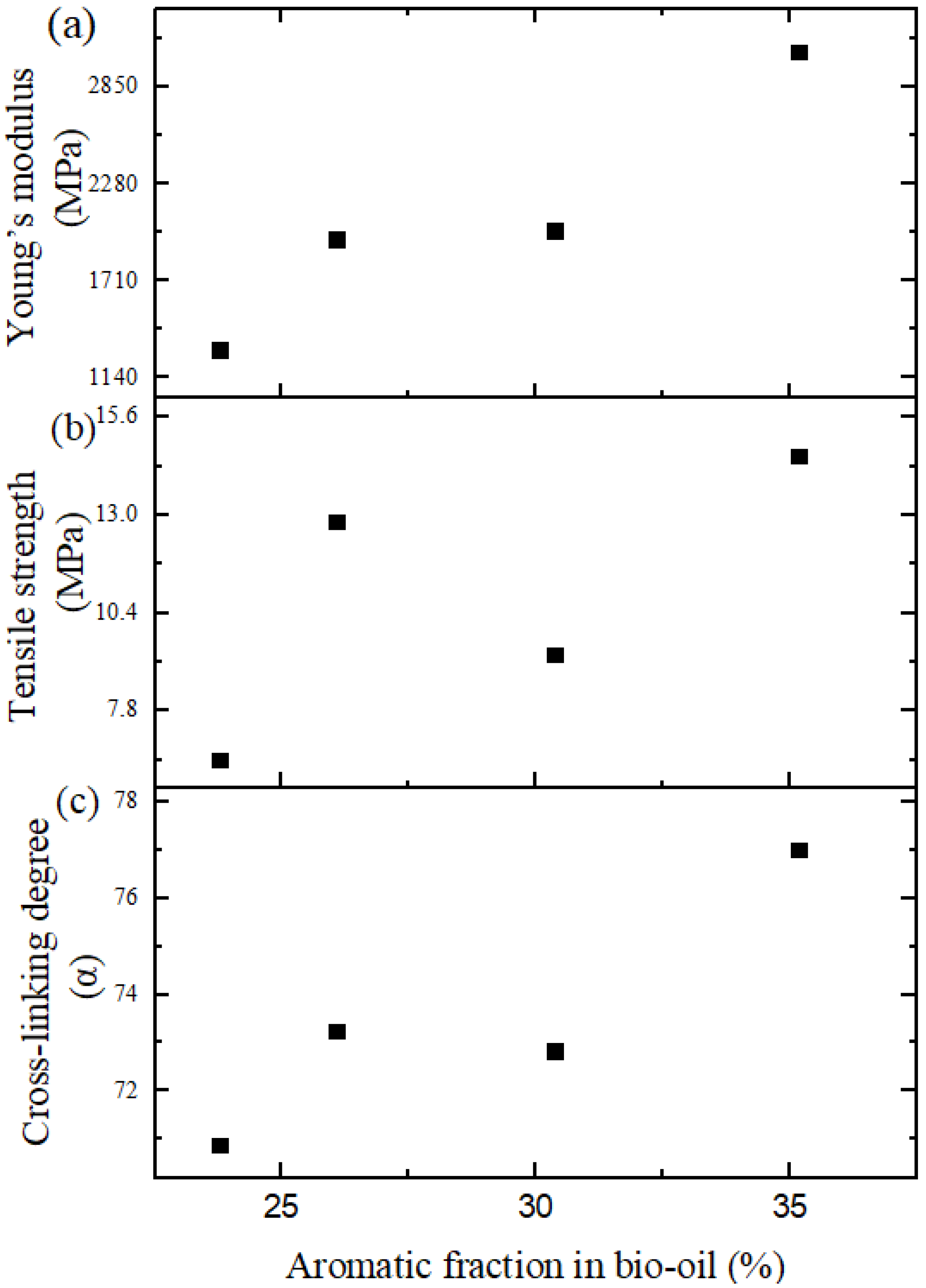 3.7. Semi-Quantitative Analysis of Aromatic Fraction of the Bio-Oil on Cure Development and Mechanical Performance