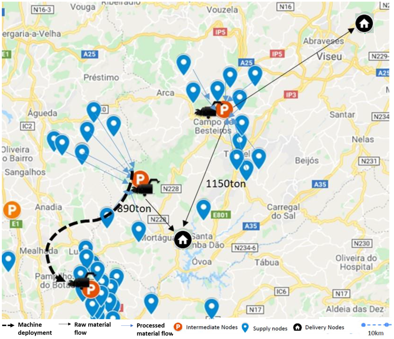 - Gomes, R.; Marques, A.; Neves-Moreira, F.; Netto, C.A.; Silva, R.G.; Amorim, P. Enhancing Flexibility in Forest Biomass Procurement: A Matheuristic Approach for Resilient Bioenergy Supply Chains Under Resource Variability. Processes 2025, 13, 2074. [Google Scholar] [CrossRef]