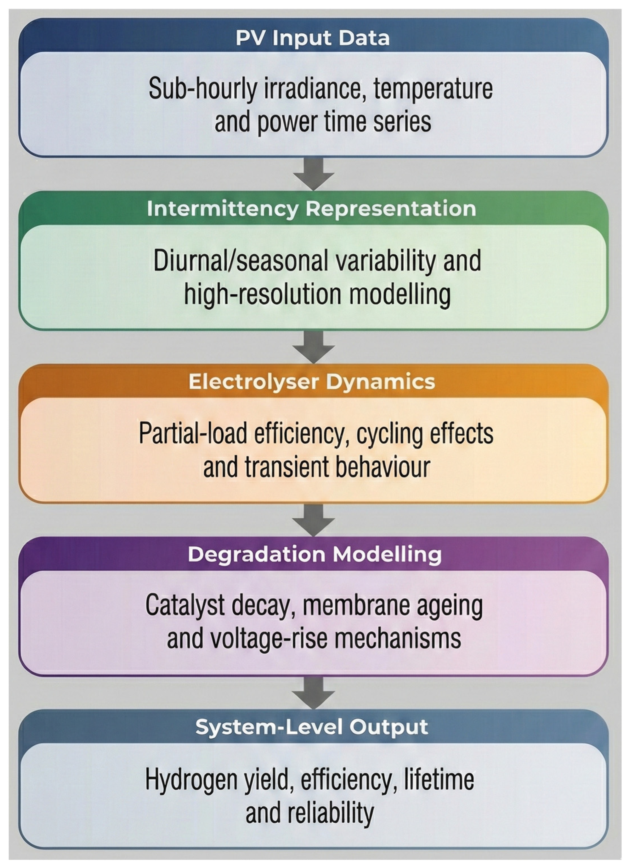 - Absence of long-term degradation data under fluctuating renewable operation.Although recent studies have significantly improved understandings of individual degradation mechanisms in PV modules and electrolysers, only a limited number of studies report multi-year degradation behaviour when electrolysers are subjected to variable solar loading. Existing degradation models are typically extrapolated from steady operation, creating uncertainty in lifetime estimates, replacement schedules and long-term hydrogen cost projections. This disconnect between advanced component-level degradation models and the scarcity of long-term field data under intermittent operation remains a critical unresolved issue.