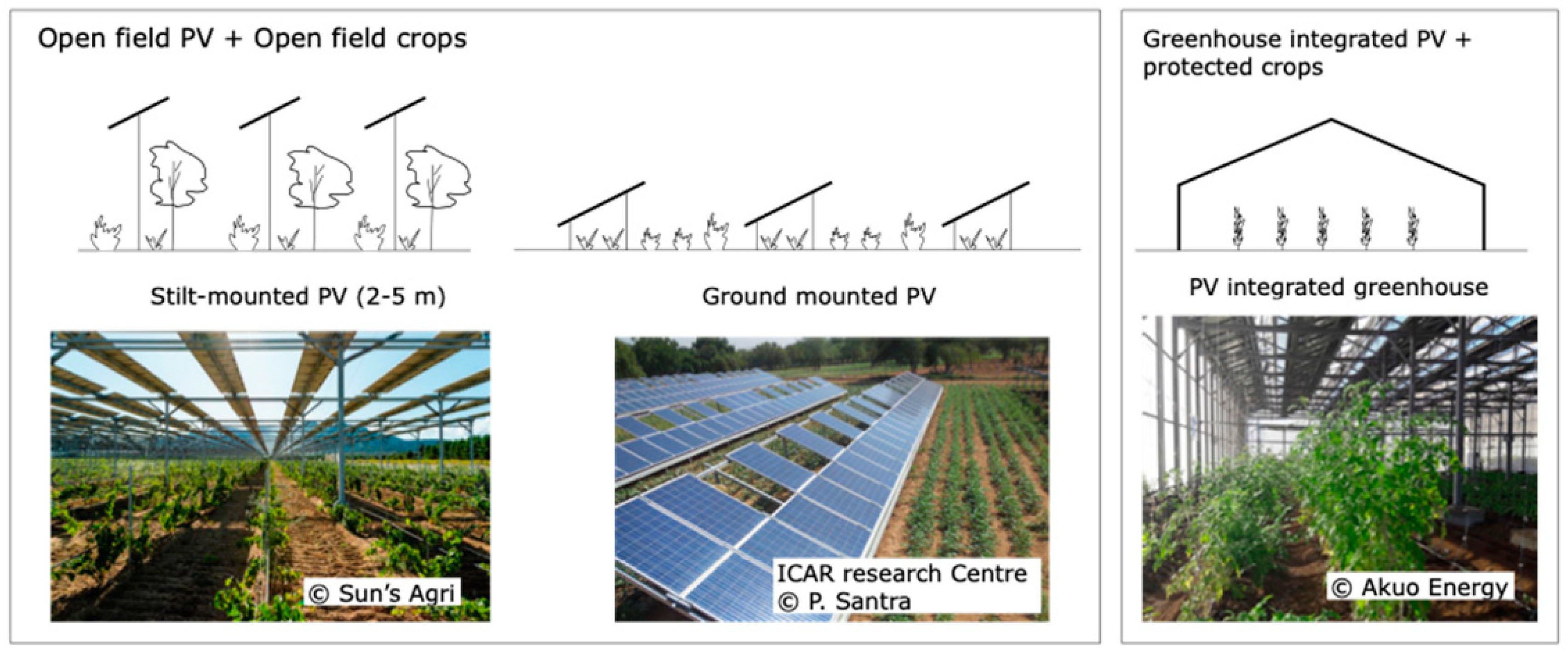 - Ghosh, A. Nexus between Agriculture and Photovoltaics (Agrivoltaics, Agriphotovoltaics) for Sustainable Development Goal: A Review. Sol. Energy 2023, 266, 112146. [Google Scholar] [CrossRef]